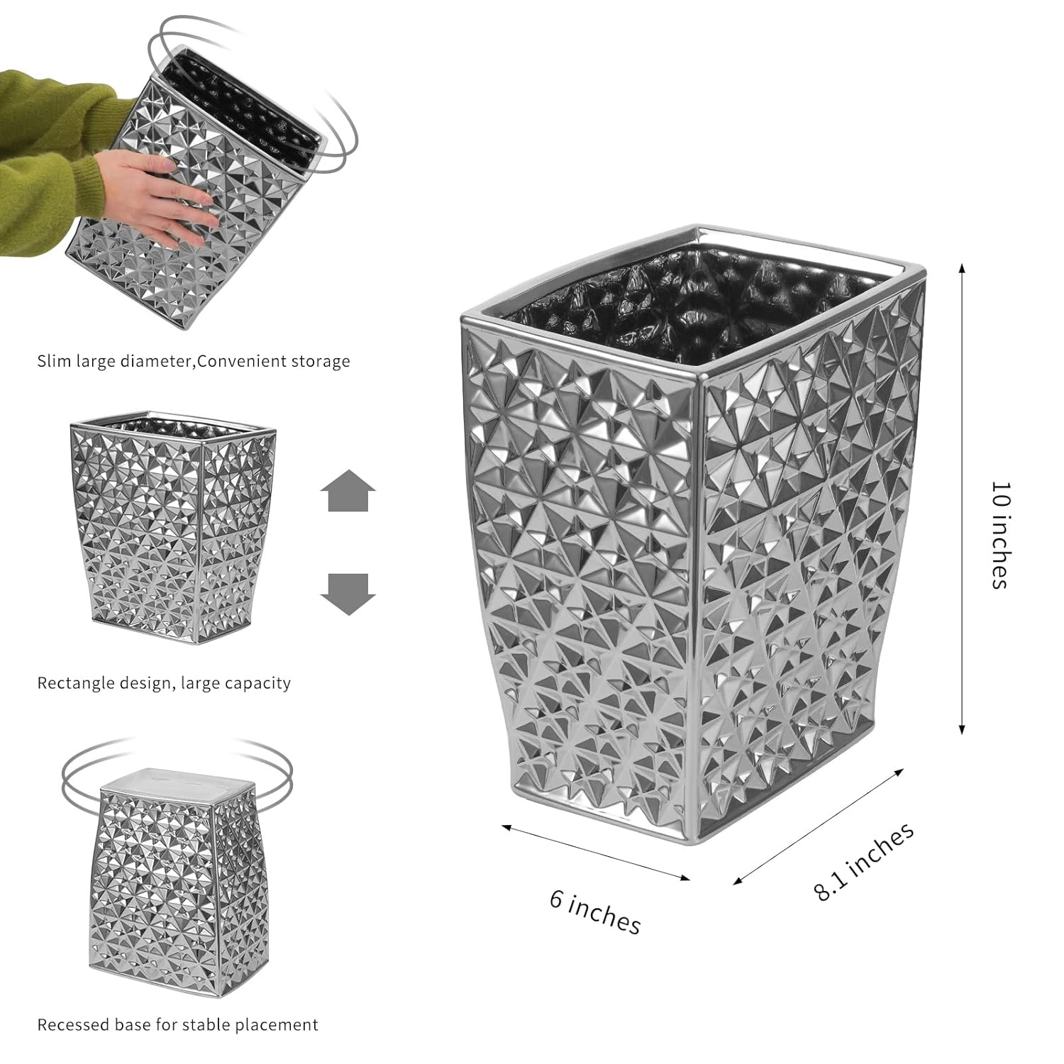 Ceramic Rectangular Small Trash Can - Wastebasket, Garbage Container Bin for Bathroom, Bedroom, Kitchen, Home Office, and Kids Room, Holds Waste, Recycling - Silver