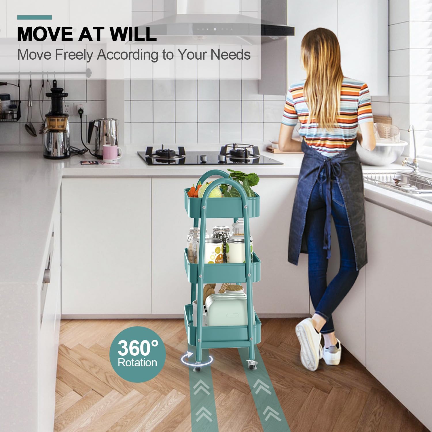 EAGMAK 3 Tier Utility Rolling Cart, Metal Storage Cart with Handle and Lockable Wheels, Multifunctional Storage Organizer Trolley with Mesh Baskets for Kitchen, Living Room, Office, Garage (Green)
