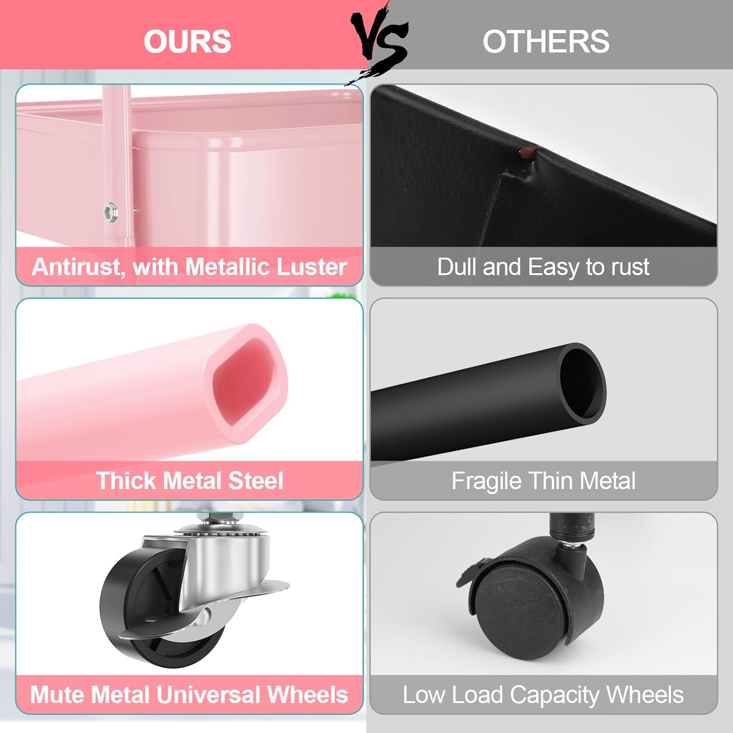EAGMAK 3 Tier Utility Rolling Cart, Metal Storage Cart with Handle and Lockable Wheels, Multifunctional Storage Organizer Trolley with Mesh Baskets for Kitchen, Living Room, Office, Garage (Pink)