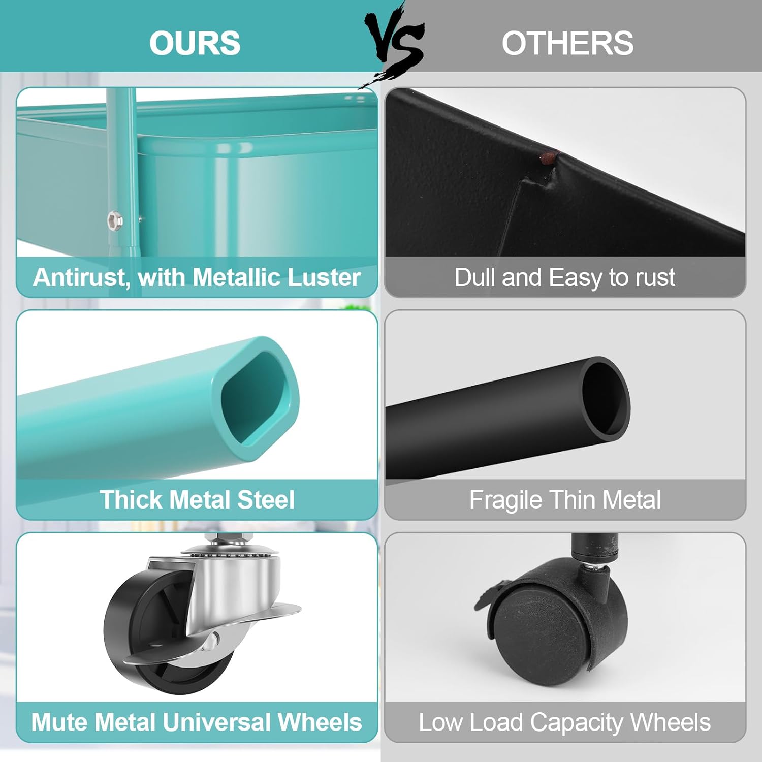 EAGMAK 3 Tier Utility Rolling Cart, Metal Storage Cart with Handle and Lockable Wheels, Multifunctional Storage Organizer Trolley with Mesh Baskets for Kitchen, Living Room, Office, Garage (Turquoise)