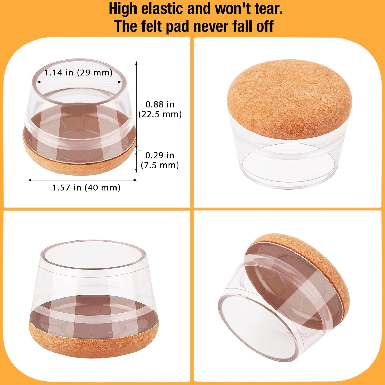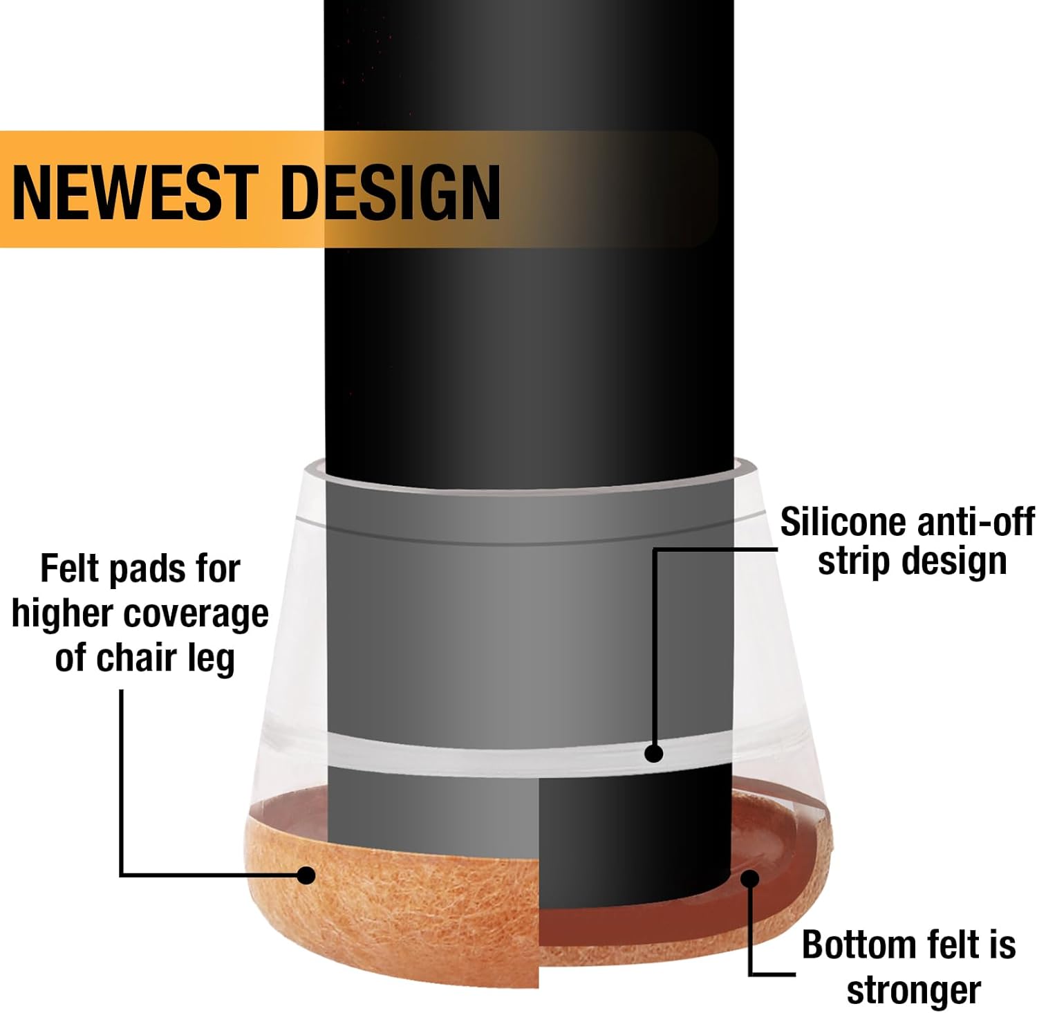 - 【Upgrade New Design】: 360° full felt pad bottom wrapped, which helps the felt bottom be able to touch the floor at any angle, preventing scratching the floor. Our chair leg floor protectors do not use gel. The bottom felt pad and the silicone chair leg floor protectors are integrated with a high-pressure machine to ensure that they will never fall off.