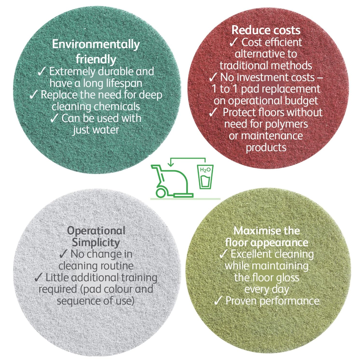 - Diamond infused floor care pad for cleaning and burnishing of both coated and non-coated floors. 100% recycled premium PET fibers with a higher more refining grit and superior quality and longer life. Lasts 3 to 4 times longer than a conventional pad