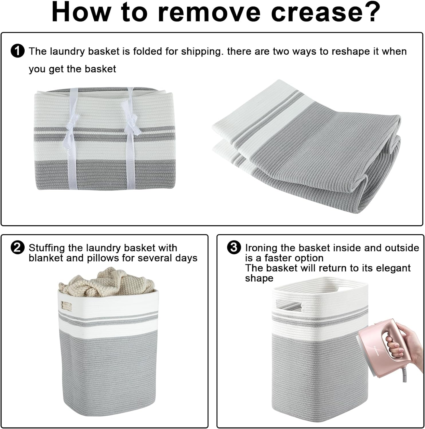 - Satisfaction & Note : We have invested a lot of love and effort in designing and manufacturing the best laundry baskets for our customers, so we support our quality and craftsmanship. If you are not satisfied for any reason, please let us know and we will replace your shopping basket for free or a full . NOTE: The laundry hamper is folded, but it will turn back to its elegant shape quickly if you fill it with some towels or blankets, and iron is great idea to remove the creases