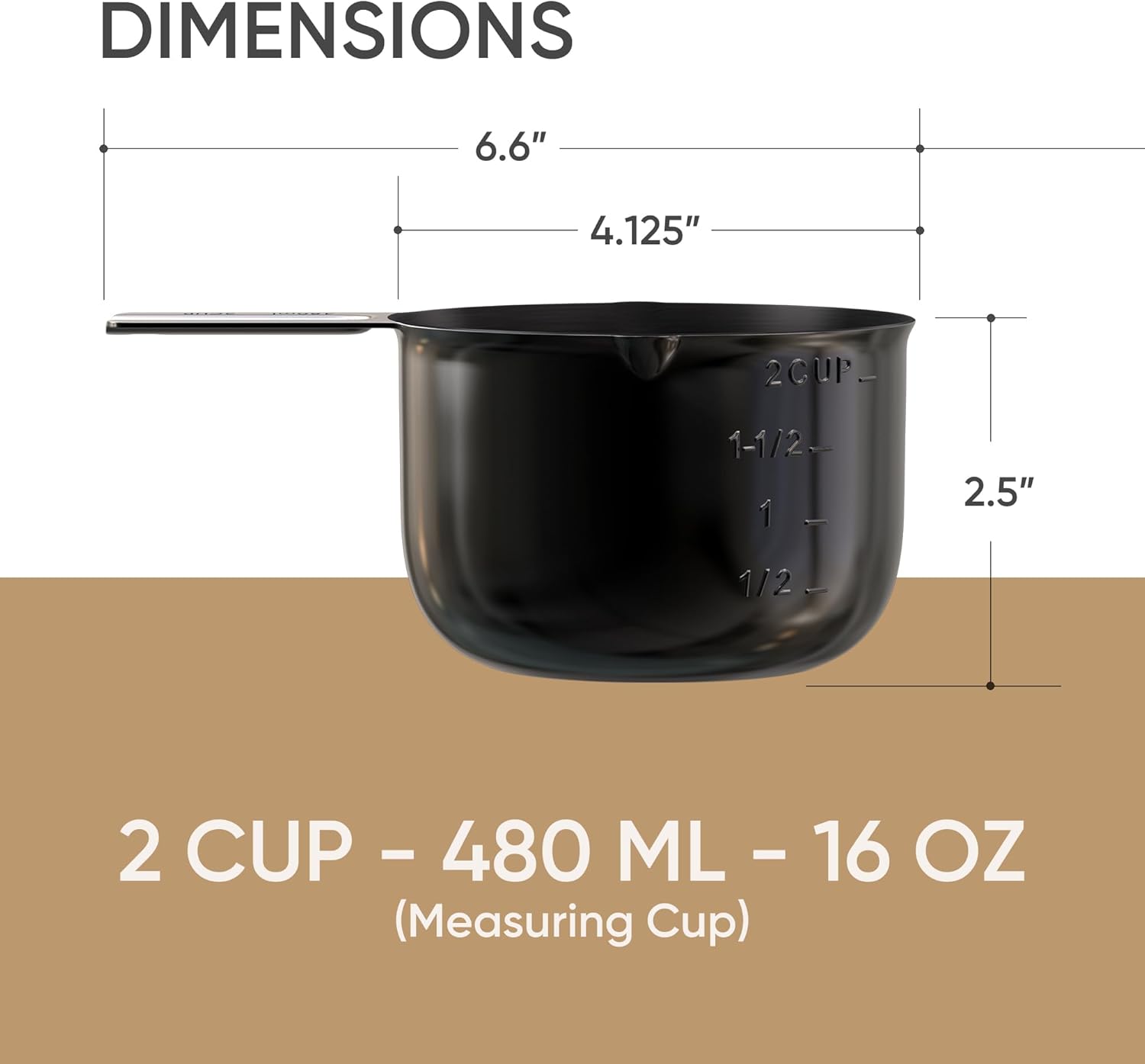 - Black 2 Cup Measuring Scoop with Engraved Markings: Laser-etched with 2 cup (2 tazas), 1½, 1, ½ cup, and 480ml indicators. Clear, permanent measurements in both US and metric units.