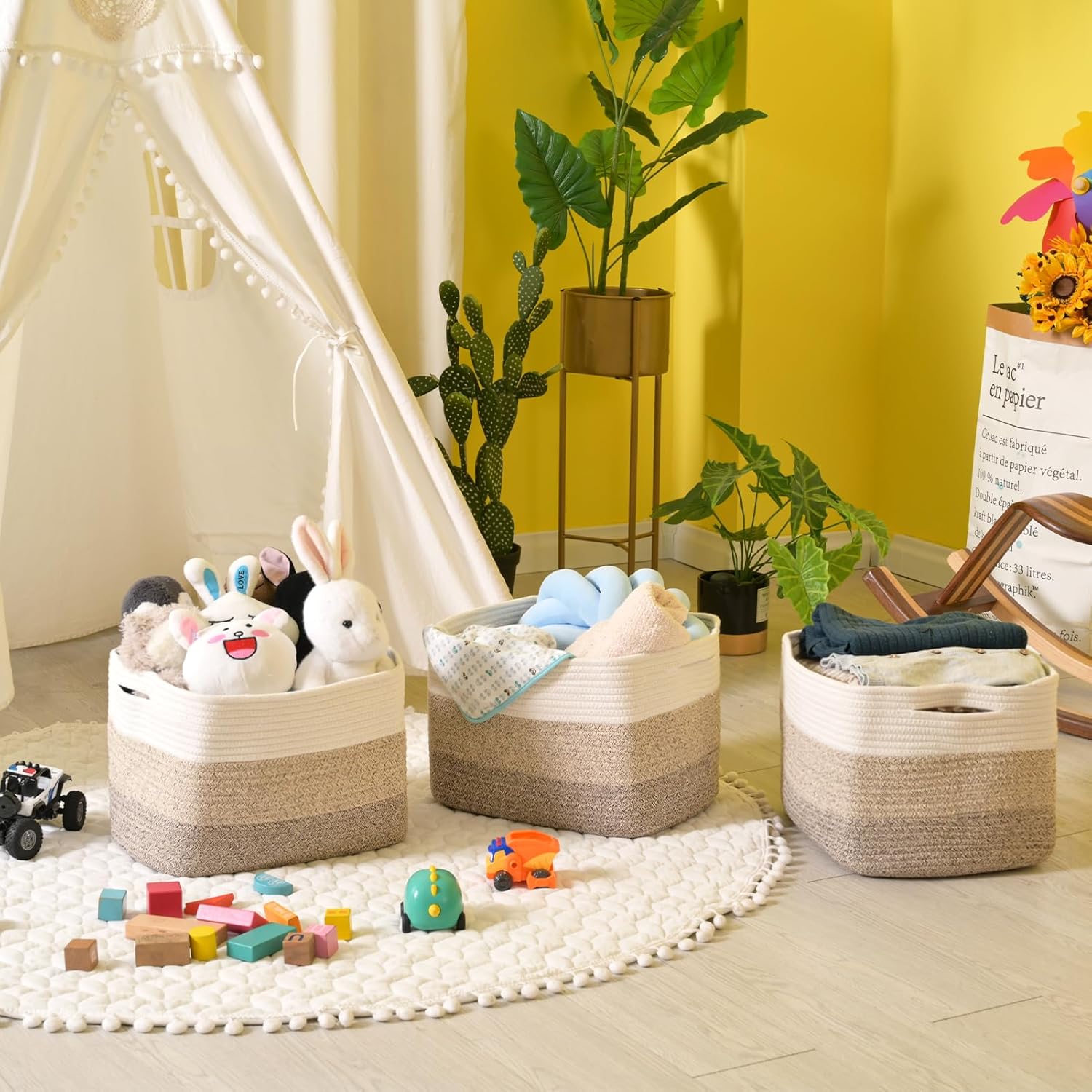 Storage Baskets for Organizing Shelves, Woven Cotton Rope Bins for Baby Nursery Organization, Book Toy Towel Organizer, 15"x11"x9.5", 3 Packs, Gradient Brown
