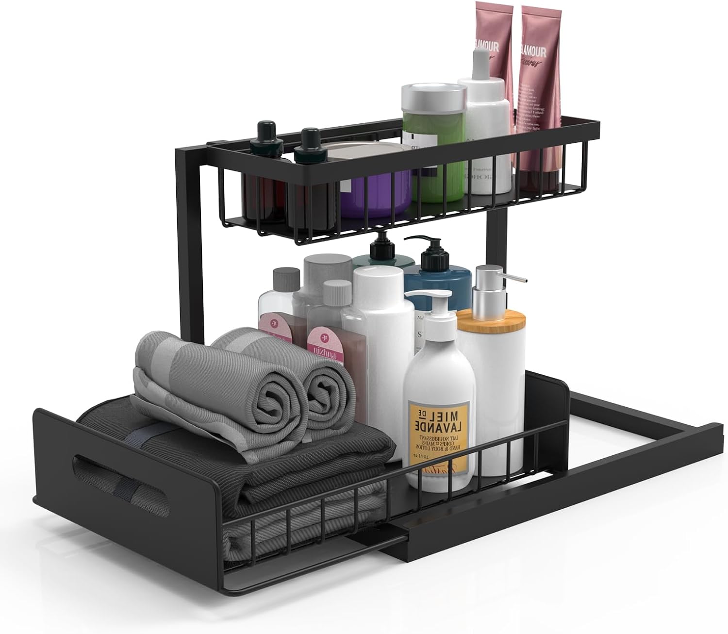 - [Space Saving] Organize the space under your cabinets with this 2-tier under sink storage. This under the sink organizer can solve your under cabinet storage troubles and increase the utilization of limited sink space. With pull out cabinet organizer, you have room for all your stuff, and a slide-out system like this makes it easier to access everything you store under the sink