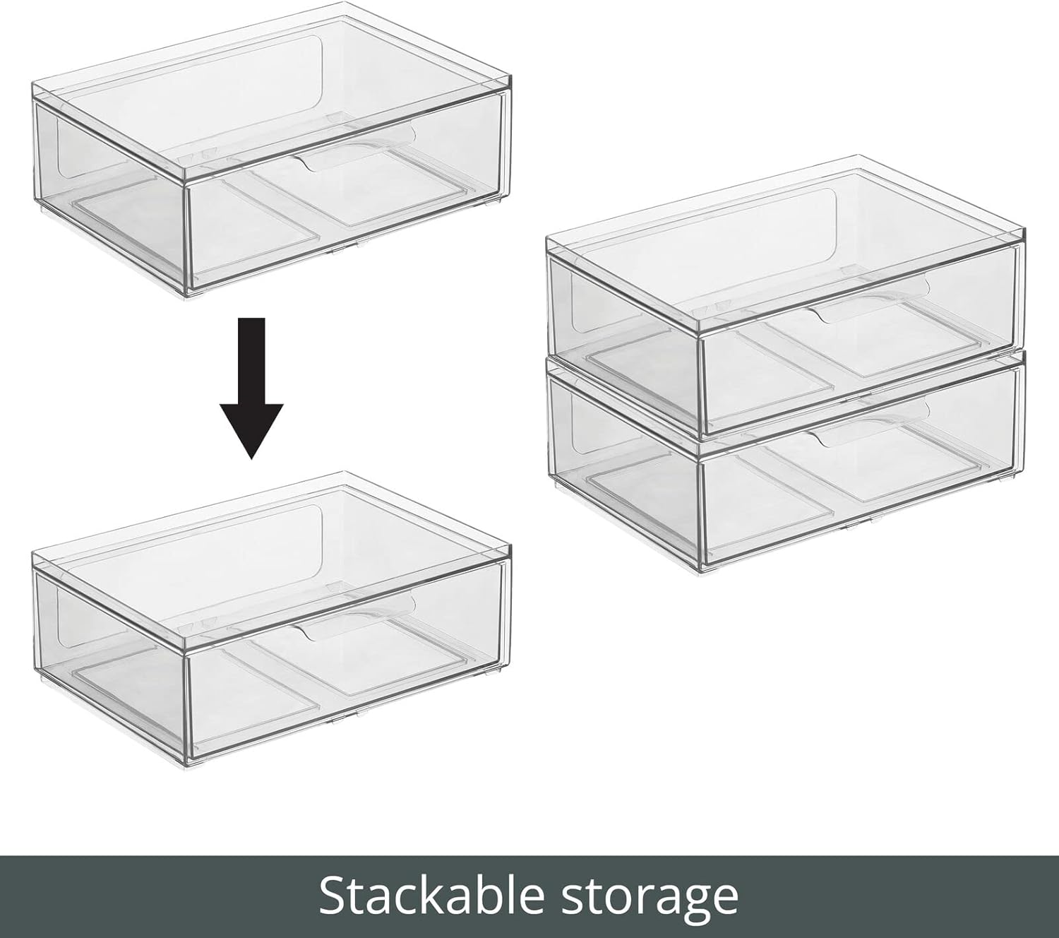 mDesign Plastic Wide Stackable Kitchen Storage Organizer Bin Containers with Front Pull Drawer for Cabinet, Pantry, Fridge, Freezer, Shelf, Refrigerator Organization, Lumiere Collection, 4 Pack, Clear
