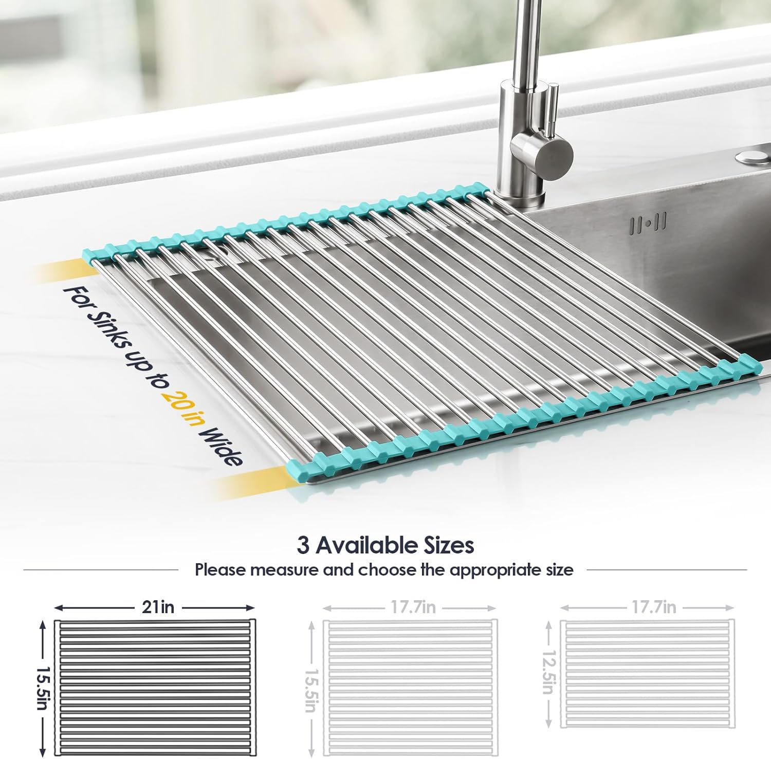 Tomorotec 21" x 15.5" Roll Up Dish Drying Rack Over Sink Drying Rack Sink Cover Kitchen Sink Accessories Gadget Multipurpose Organizer Foldable Stainless Steel Drainer