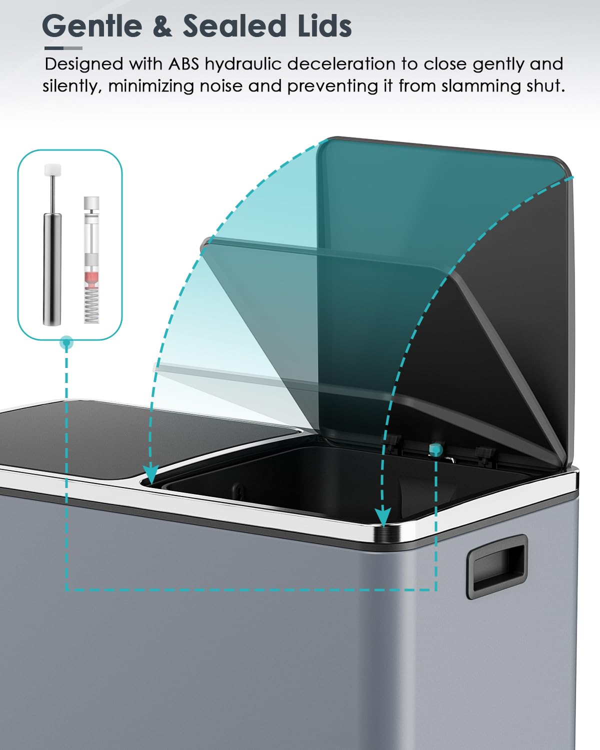 - DUAL TRASH CAN: Trash can has double compartments, which makes it easier for you to separate dry and wet trash. Each compartment has an independent lid to make the trash no smell pollution exists.