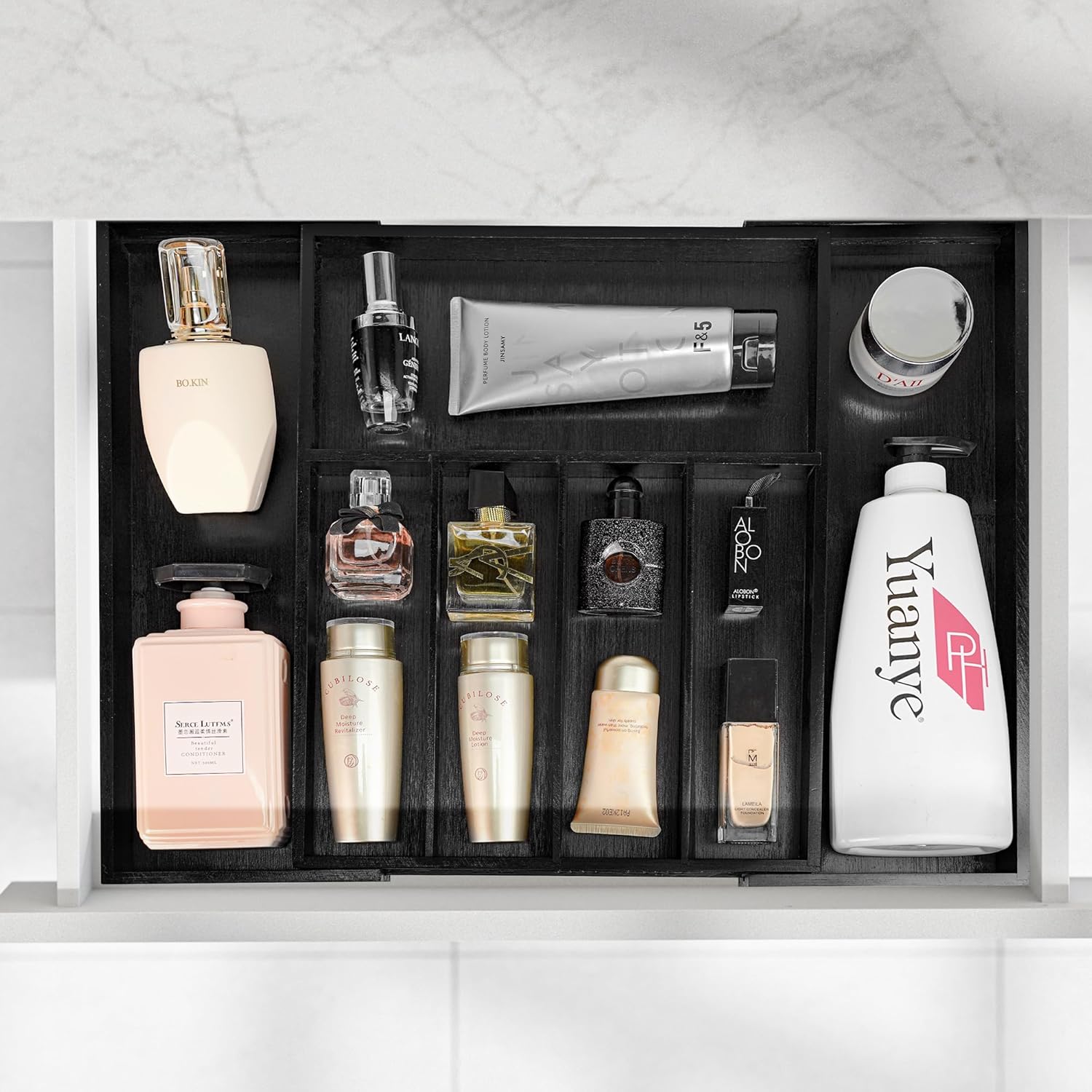VaeFae Premium Bamboo Drawer Organizer, Expandable Silverware Drawer Organizer, Cutlery Tray with Dividers for Kitchen Utensils (Black, Large)