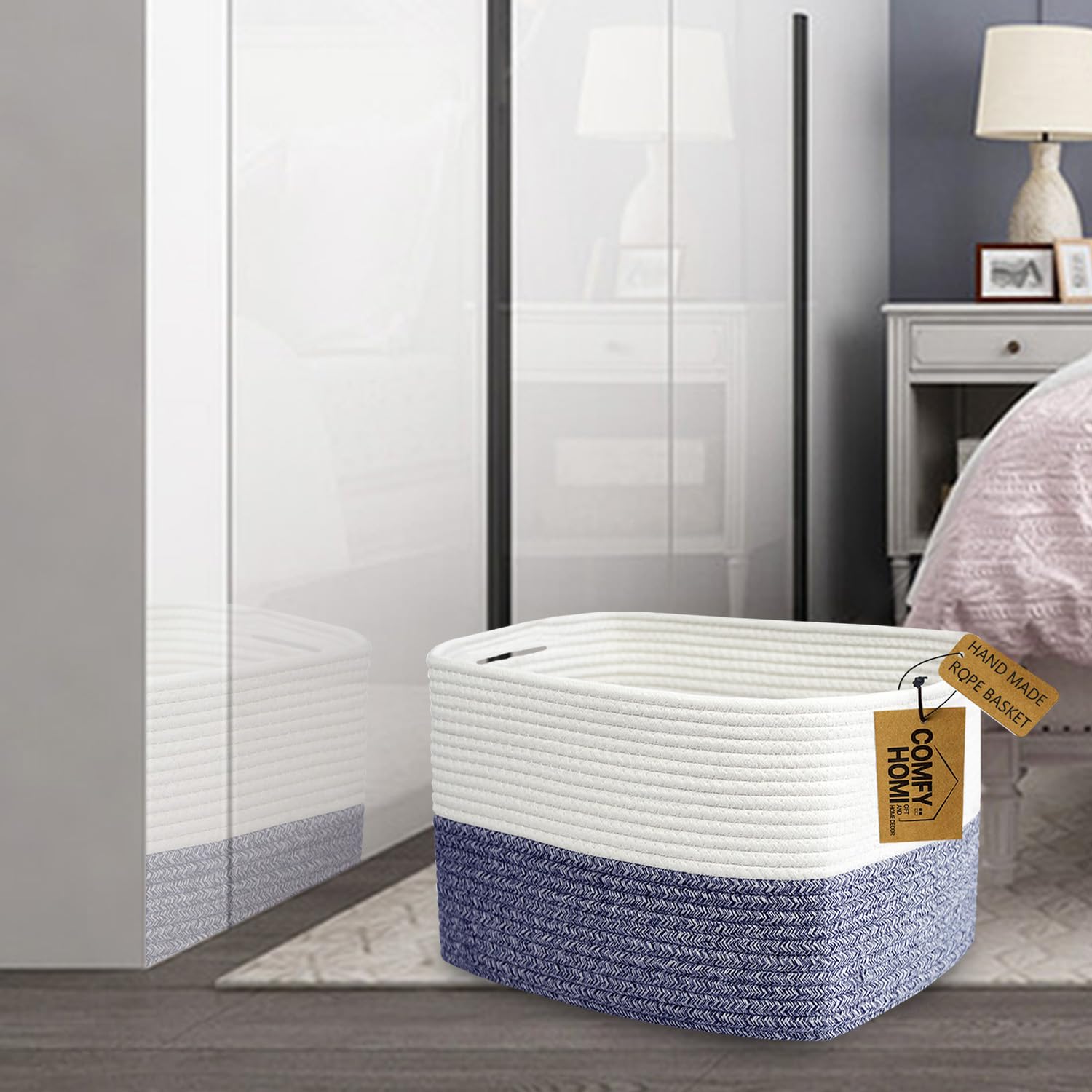 COMFY-HOMI 3 Pack Medium Cotton Rope Basket with Handles for Shelves, Dog Toy, Baby, Gift Organizing, Handwoven Craft - New Generation 13.5" x 11" x 9.5" (Navy Blue)