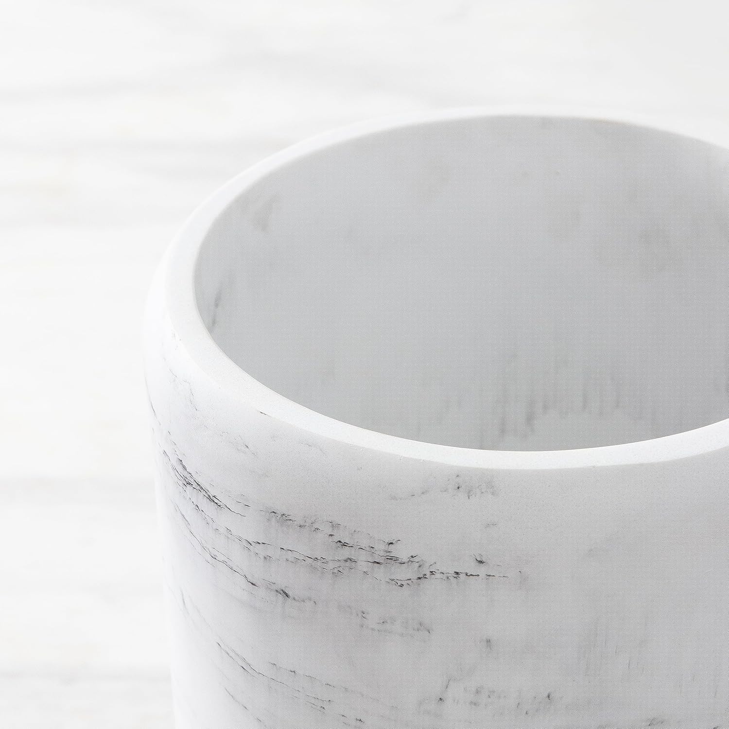 - Marble look round can, This round can has the perfect size. The size and style make this can work in so many places throughout your home, Ideal for home office, bedrooms, craft rooms, dens, and any other room that requires a decorative waste can.