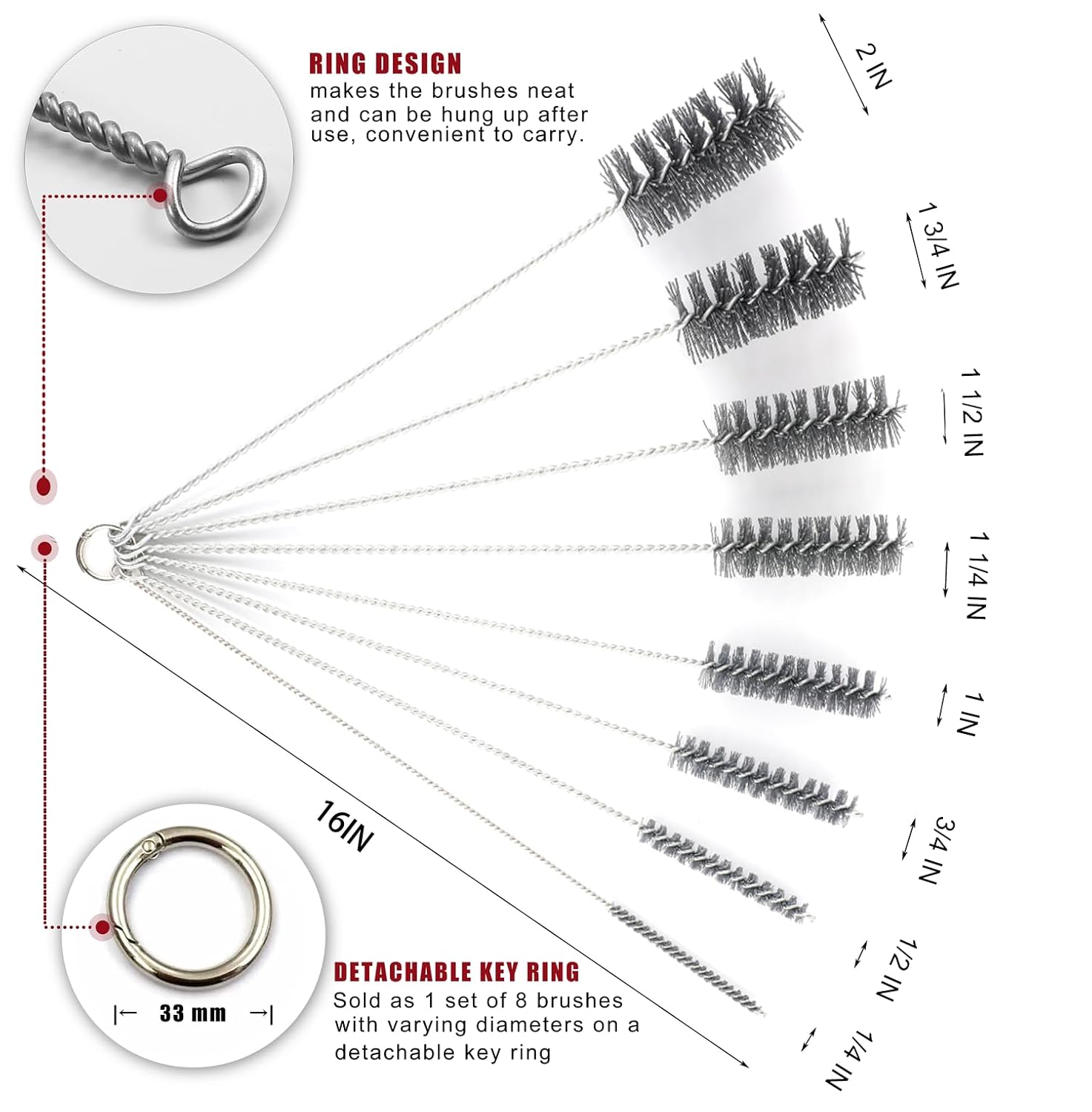 - ★MULTIPLE SIZE –Brush Diameters: 1/4, 1/2, 3/4, 1, 1 1/4, 1 1/2, 1 3/4, 2 In (6, 13, 19, 25, 32, 38, 45, 50 Mm Each 16 In (400 mm) In Length
