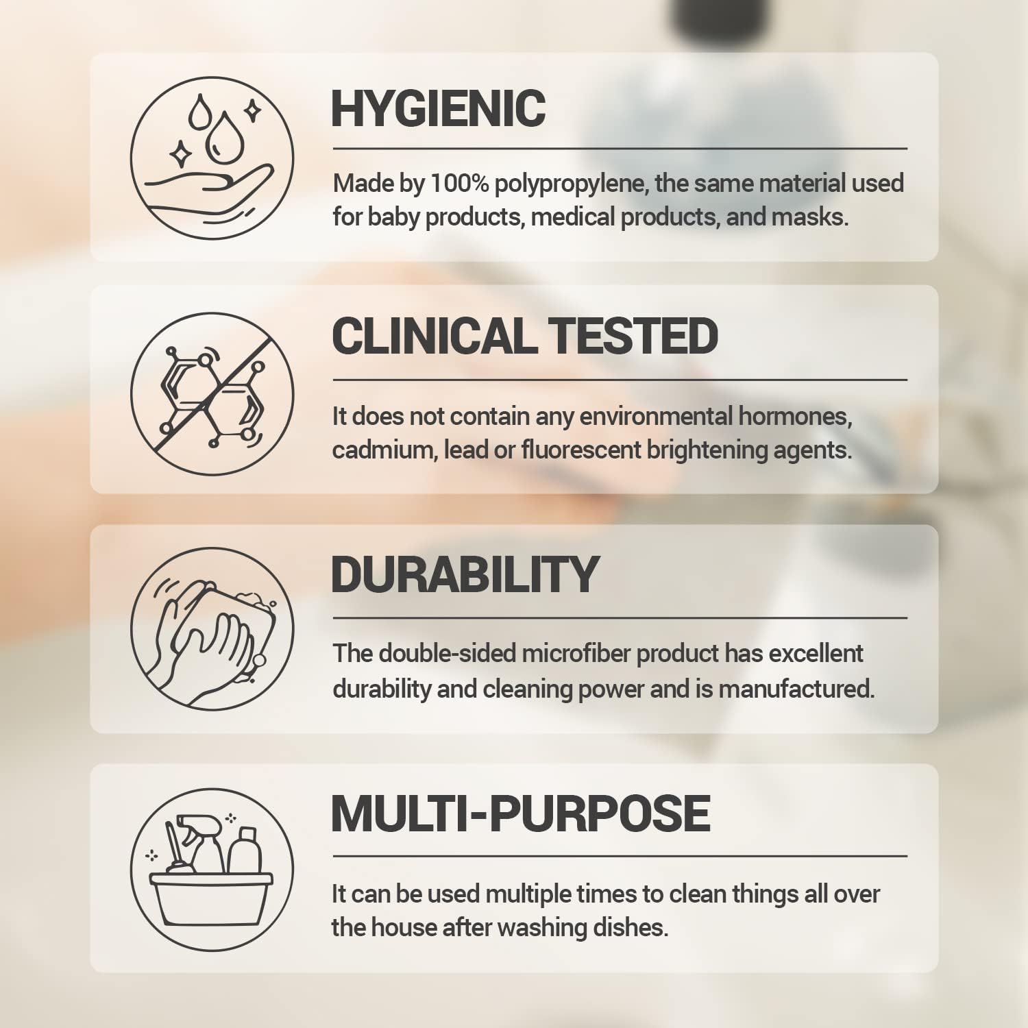 - DURABLE AND HIGH-QUALITY MATERIALS: These cleaning cloths for kitchen are made using 100% polypropylene material. The same material is used for baby products and medical products, and masks. These double-sided microfiber cleaning rags have excellent durability and power to clean cookware, cooktops, and counters.