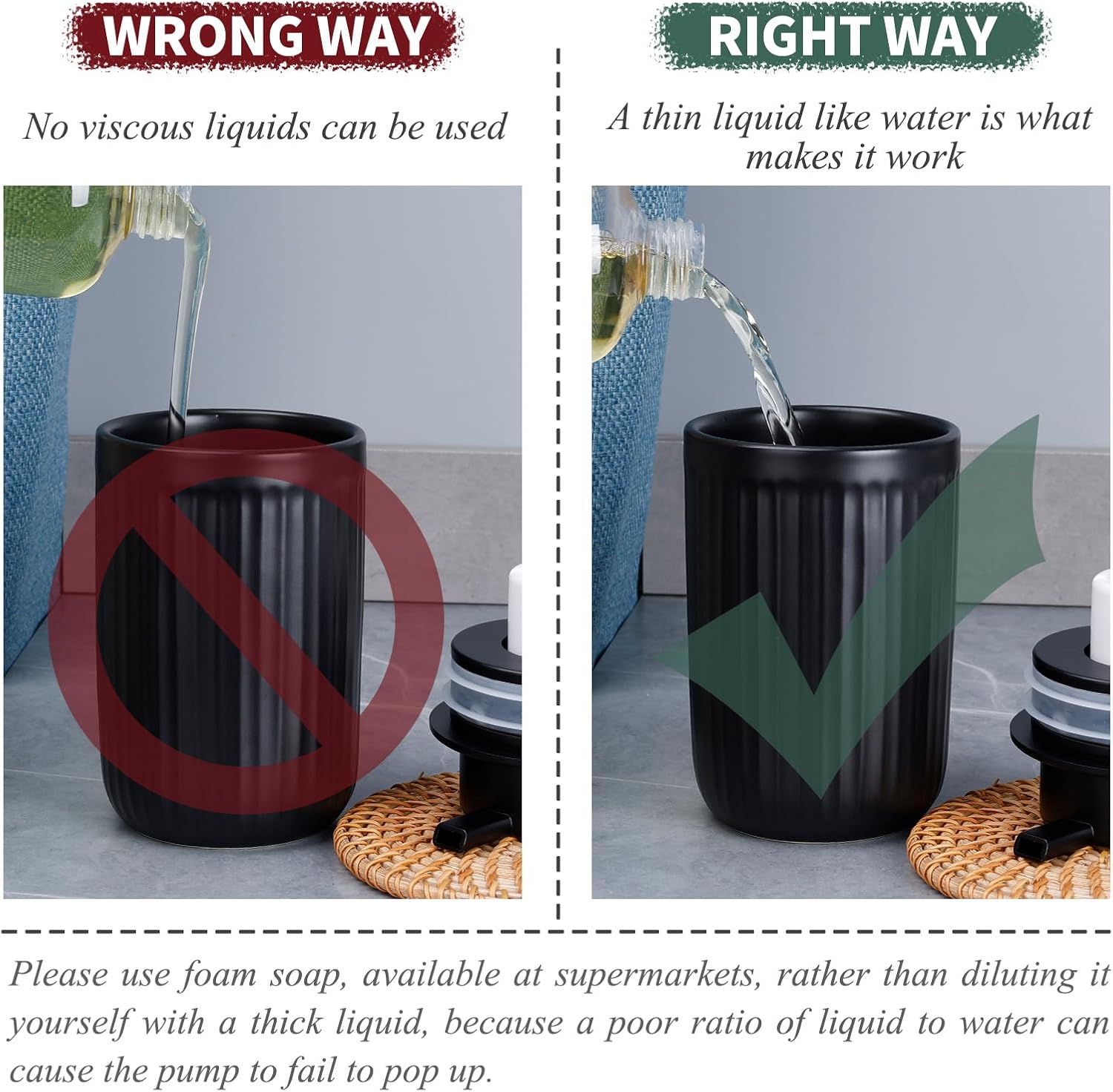 - Multi-use: The black soap dispenser used for foam hand soap filler and foam dish soap filler. And after removing the pump head, it can be used as a tumbler or toothbrush holder