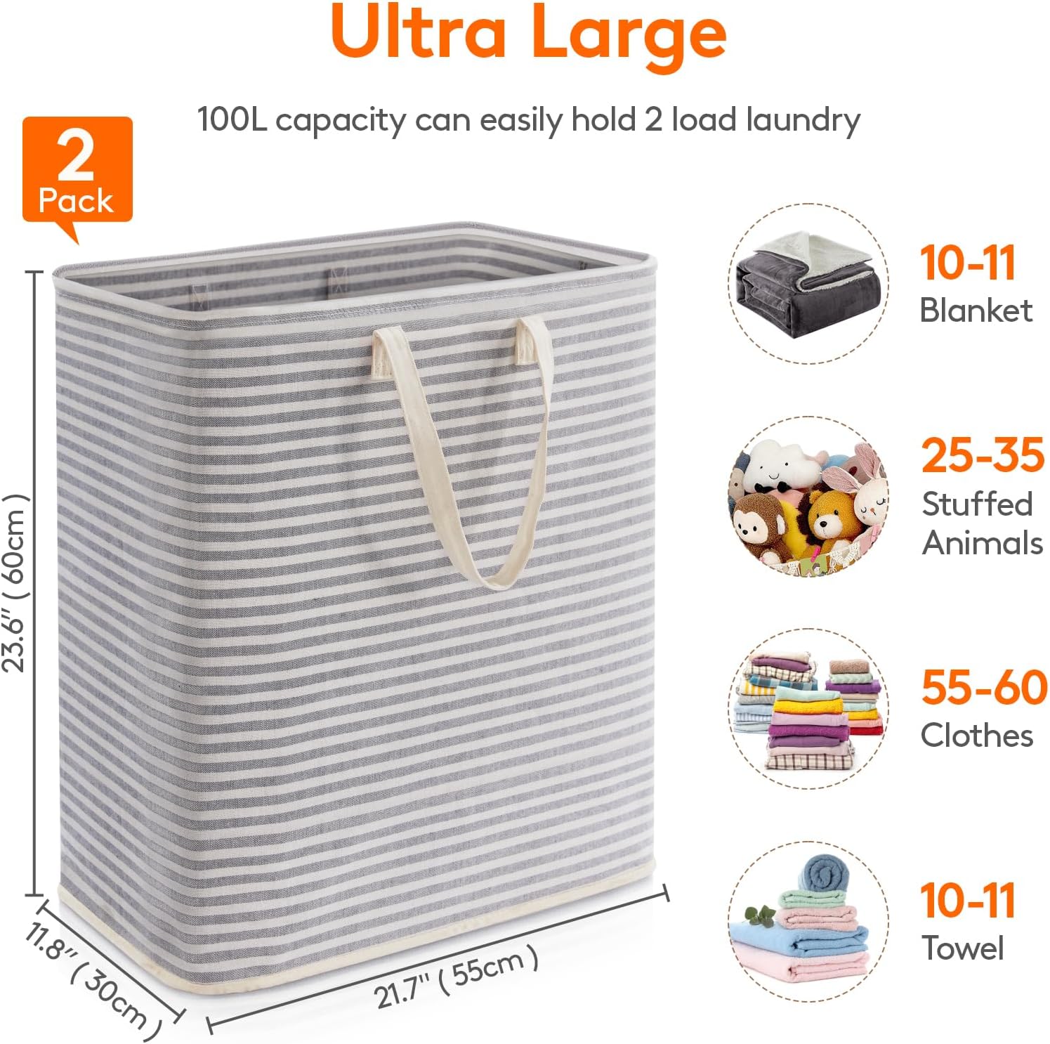 - Ultra Large: Each laundry bag measures 21.7"(55cm) x 11.8"(30cm) x 23.6"(60cm) with a capacity of 100L that easily contains 2 loads of laundry. It can hold many items such as dirty clothes, wet towels, sheets, etc.