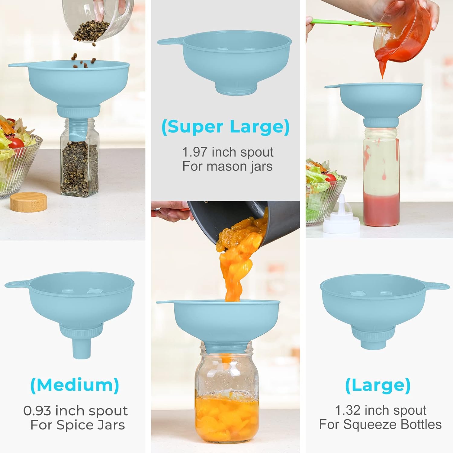 - Size: The funnel spout sizes are: 0.44 '' (1.11 cm), 0.67 '' (1.70 cm), 0.93 '' (2.36 cm), 1.32 '' (3.35 cm), 2 '' (5.08 cm)