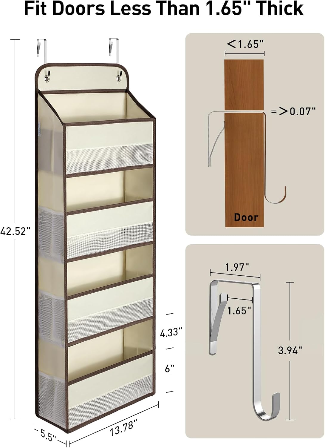 - Easy to Assemble: Afraid of tricky assembly? Don't worry. Our behind door organizers for bedroom can be assembled in 30 seconds, simply by hanging the hook on the door, hanging the organizer onto the hooks, and inserting the 4 bottom cardboards, all done! Additionally, our special clip-on hooks add more flexibility, making the bathroom storage shelves universally fit solution for doors less than 1.65" thick