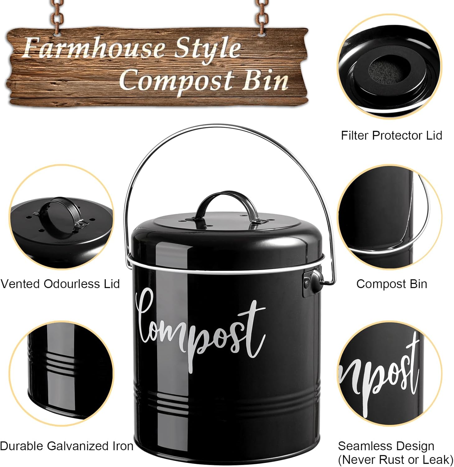 - Super Cute Farmhouse Design: Designed with the sleek text and vintage look style, this countertop compost bin will surely add a country charm to your kitchen countertops. This farmhouse compost bin fits perfectly with any modern farmhouse decor and cute kitchen accessories, you don’t need to hide this compost container below your sink.