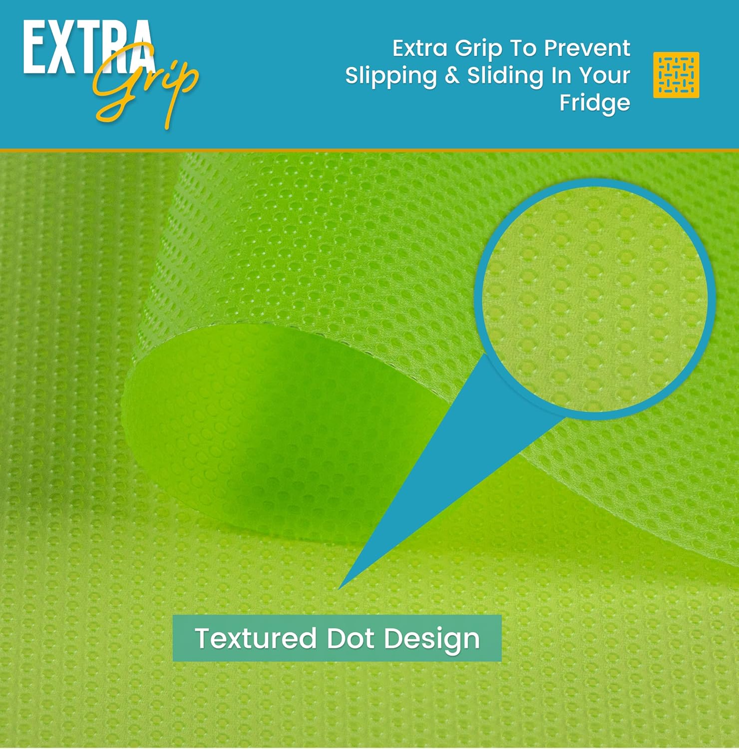 - BRIGHTEN UP YOUR FRIDGE: Our sleek green colored fridge liners bring a touch of life to your fridge, giving you a refreshing and bright look. Easily organise your foods according to the different colors, making it easy for you to separate your meats and dairies. Each pack comes with 16 waterproof and washable fridge mats measuring 17.7” by 11.4”. Simply combine 2 liners together to fit your fridge shelf if you have a large fridge, or simply use one mat per shelf