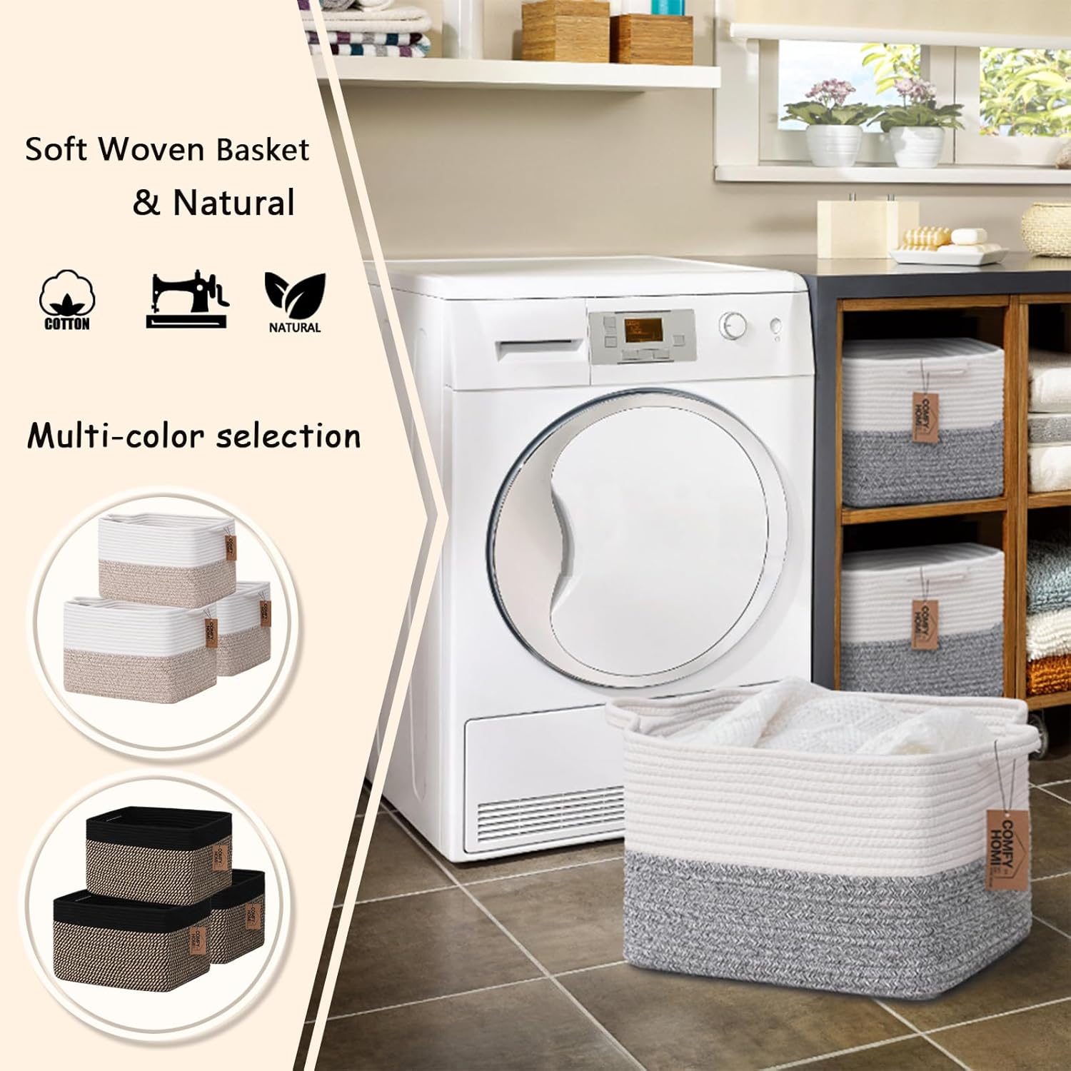 COMFY-HOMI 3-Pack Cotton Rope Woven Basket with Handles for Shelves, Book, Cloth Basket|Dog Toy Basket for Organizingy|13.5" x 11" x 9.5" for Bedroom(White/Grey)