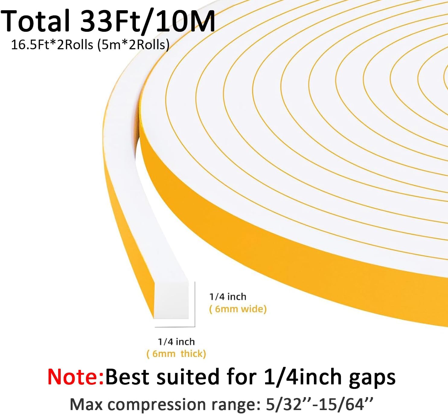 Door Weather Stripping for Doors and Window, Window Insulation Door Seal Tape, Self Adhesive Foam Gasket Tape, Foam Seal Strip Sliding Door Weather Strip, Energy-saving(1/4 in x 1/4 in x 33Ft)