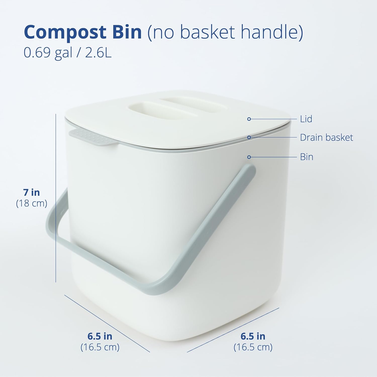 - AVAILABLE IN TWO SIZES - This small compost bin is perfect for a 2-person household. It has a capacity of 0.69 gallons or 2.6 Liters, and the outer dimensions measure W6.5 x H7 x D6.5 inches. This version does not feature a handle on the drain basket.