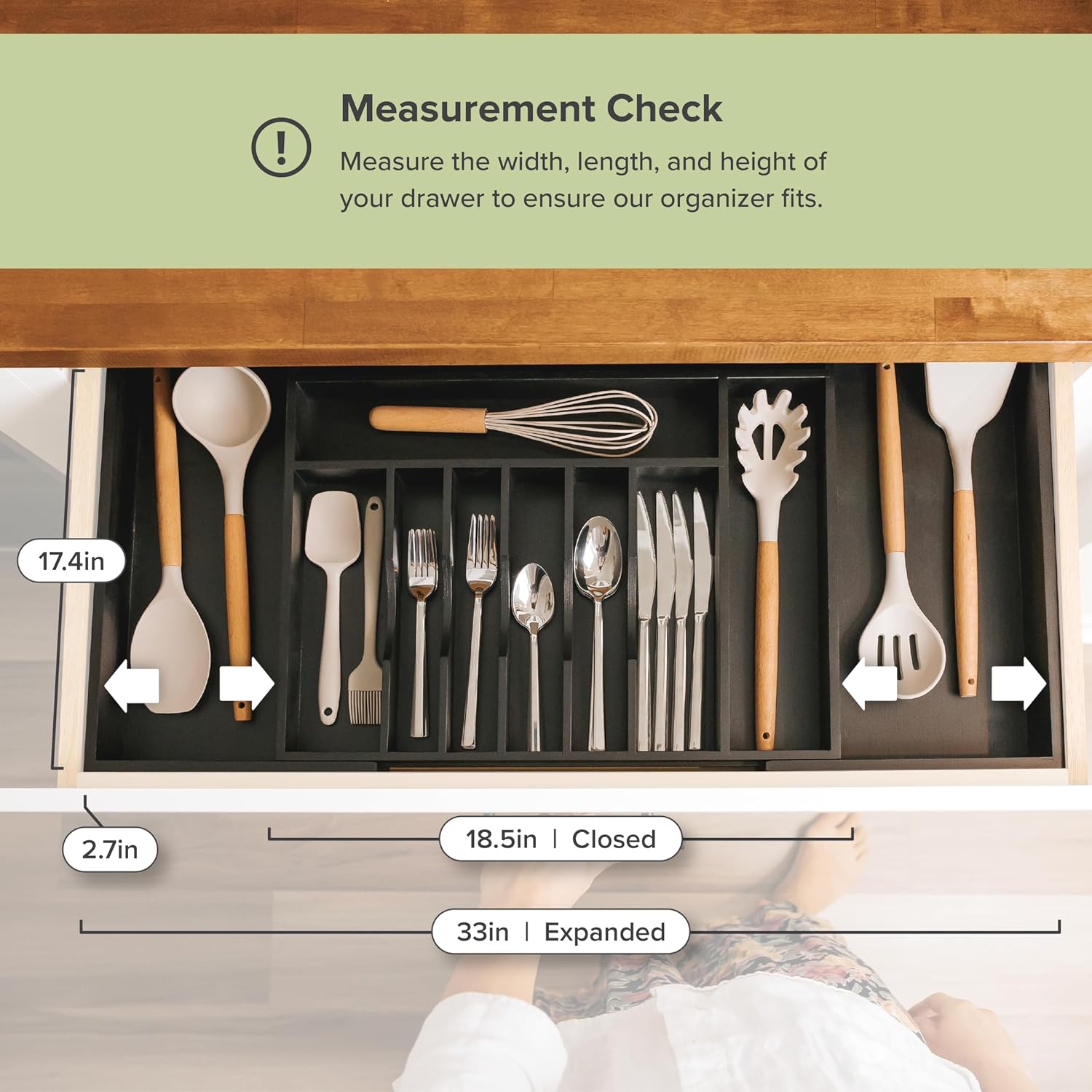 KitchenEdge Premium Silverware, Flatware and Utensil Organizer for Kitchen Drawers, Food-Safe Contract Grade, Expandable from 18 to 33 In, Black Bamboo