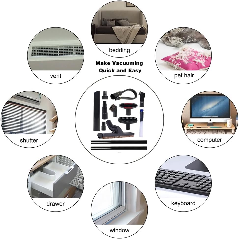 - 【Save Ti̇me &Energy Vacuum Attachments Kit】Vacuum attachments for Shop vac includes 2 1/2" to 1 1/4" Vacuum Hose Adapter, 1 7/8" to 1 3/8" to 1 1/4 to 1" and 1 3/8" to 1 1/4" vacuum adapter, 12in wide vacuum brush attachment, 1 1/4" horsehair vacuum brush, 1 1/4" flexible crevice tool, 1 1/4" vacuum crevice tool, 1 1/4" upholstery tool attachment, 1 1/4" utility nozzle with removable plastic brush, 1 1/4" brush & nozzle combination tool, dusty brush and 3 pcs vacuum extension wand.