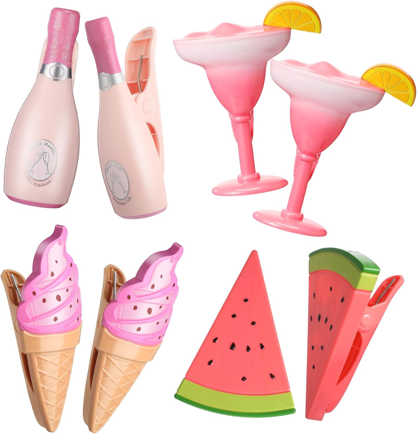- Cute and Funny: the decorative beach towel clips adopt champagne glass, gradient margarita glass, ice cream, and watermelon styles, look cute and funny, you can use them to clip clothing, towels, and bedding