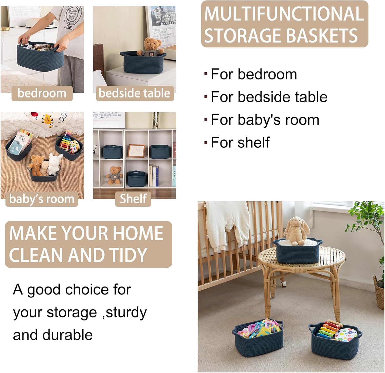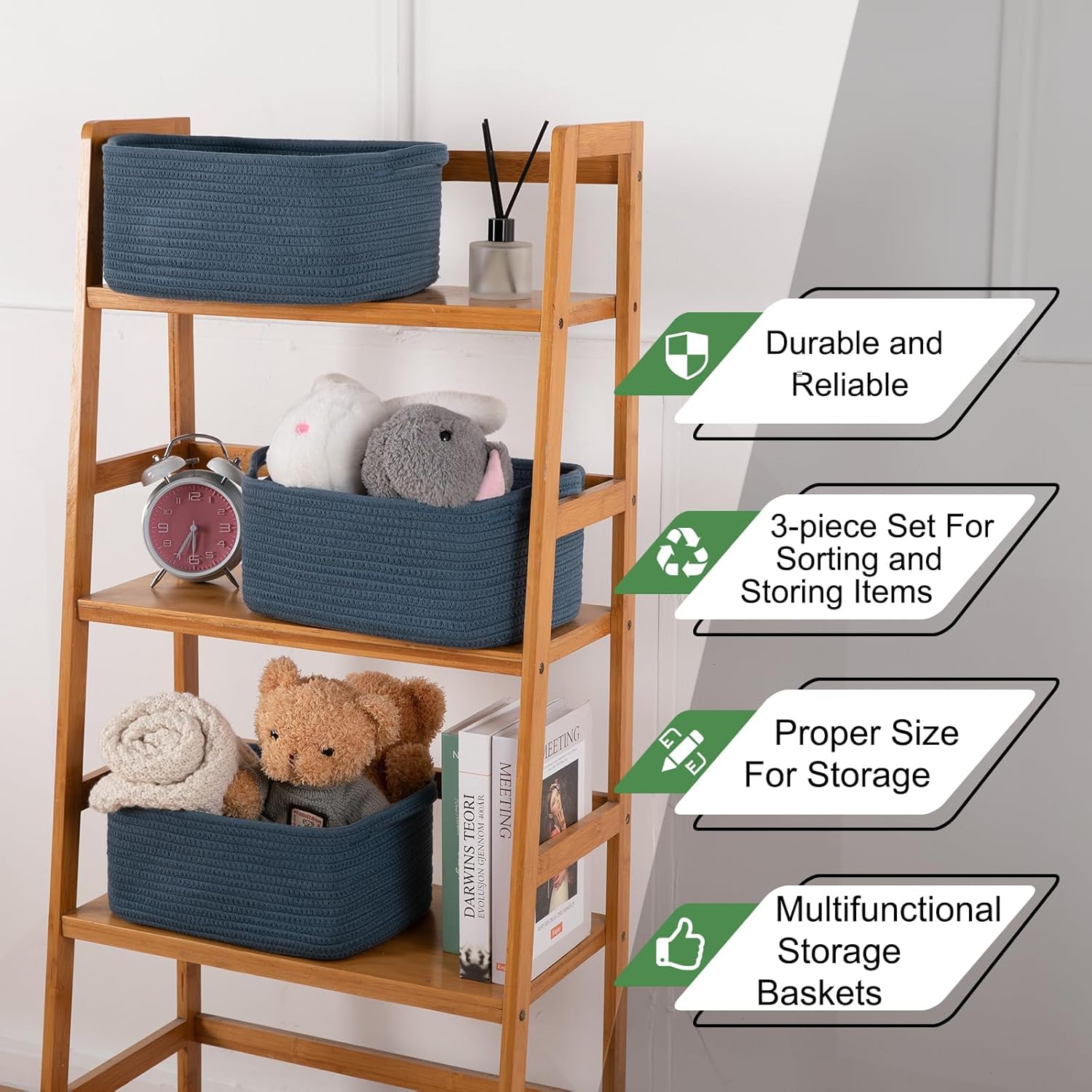 OIAHOMY Cotton Rope Woven Baskets for Storage, Nursery Rectangle Storage Basket with Handles for Shelves, Pack of 3, Blue