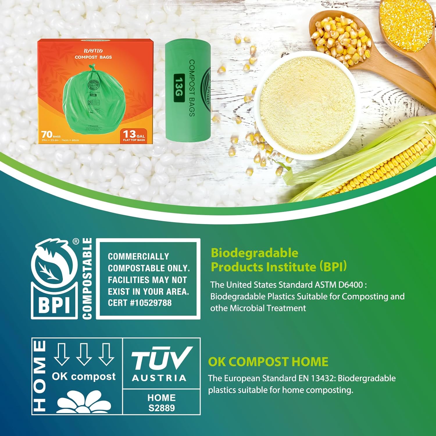 - RAYTID compostable bags are certified by BPI Compostable (ASTM-D6400&EU EN13432 standard) and OK Compost HOME (EU Standard). All professionally managed composting facilities are able to accept our compostable trash bags. Use these compost bin bags to collect kitchen scraps and put them straight into the compost bucket without ripping, turn them into organic-rich soil for gardening or household plants with leak proof but no mess and smell
