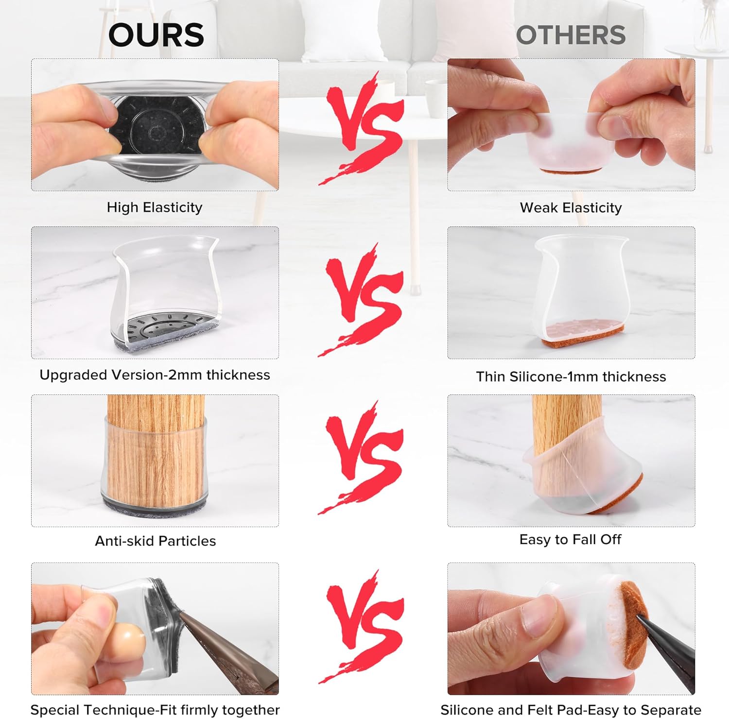 24PCS Upgraded Silicone Chair Leg Floor Protectors for Hardwood Floors, Furniture Sliders for Chair Legs, Felt Bottom Furniture Pads, Anti-Slip Round&Square Cap Covers to Scratch and Reduce Noise