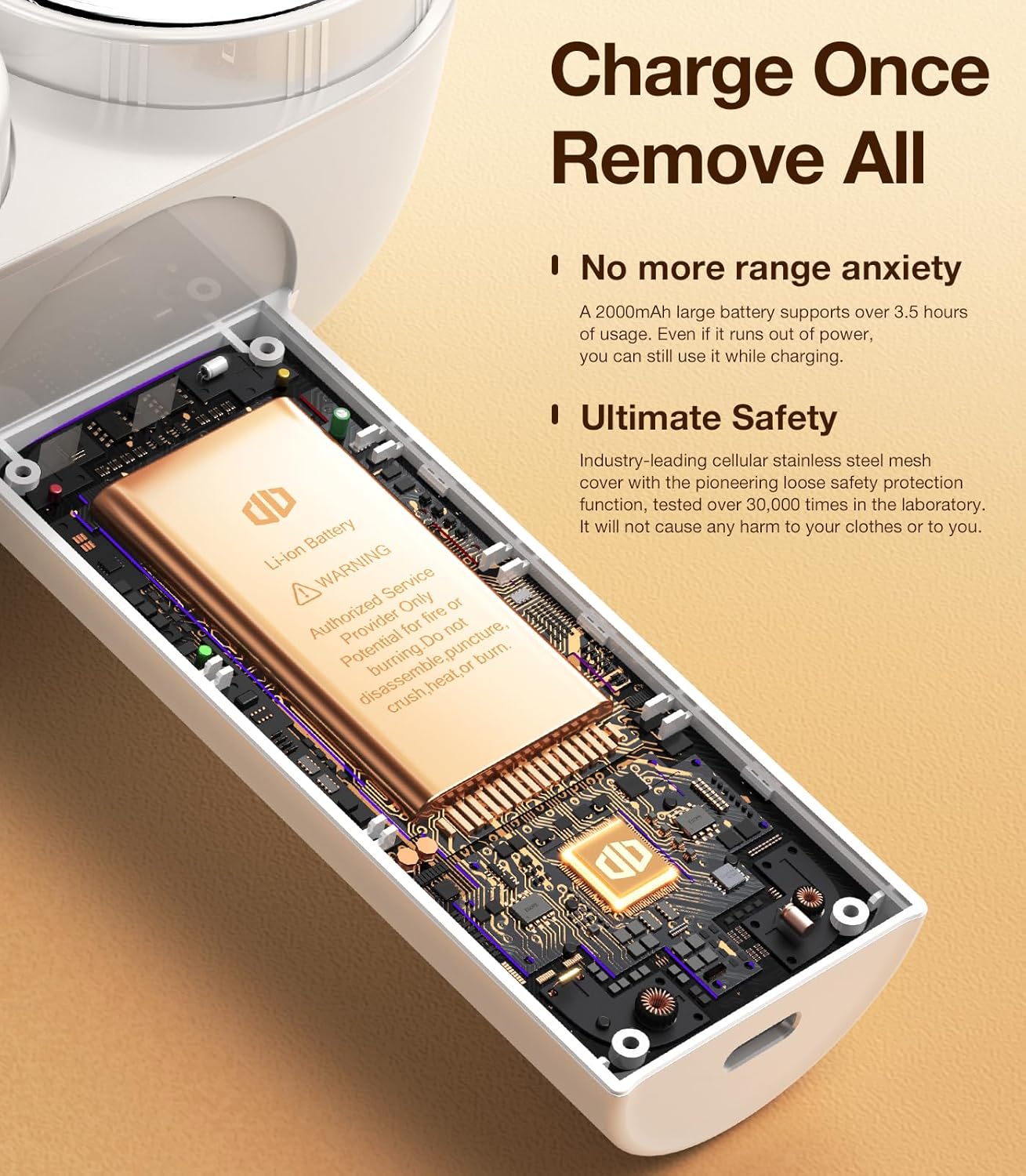 - 【Safely Re-New Your Fabric】DesertWest fabric shaver offers triple security protection. It comes with micro-arc stainless steel mesh protectors that keep clothes from damage. Smart IC chip inside lint remover will automatically power off when sensed that the cover net or the fuzz bin are not attached appropriately during installation/detachment. For charging, defuzzer will stop charging automatically when it is fully charged to prevent overcharing.