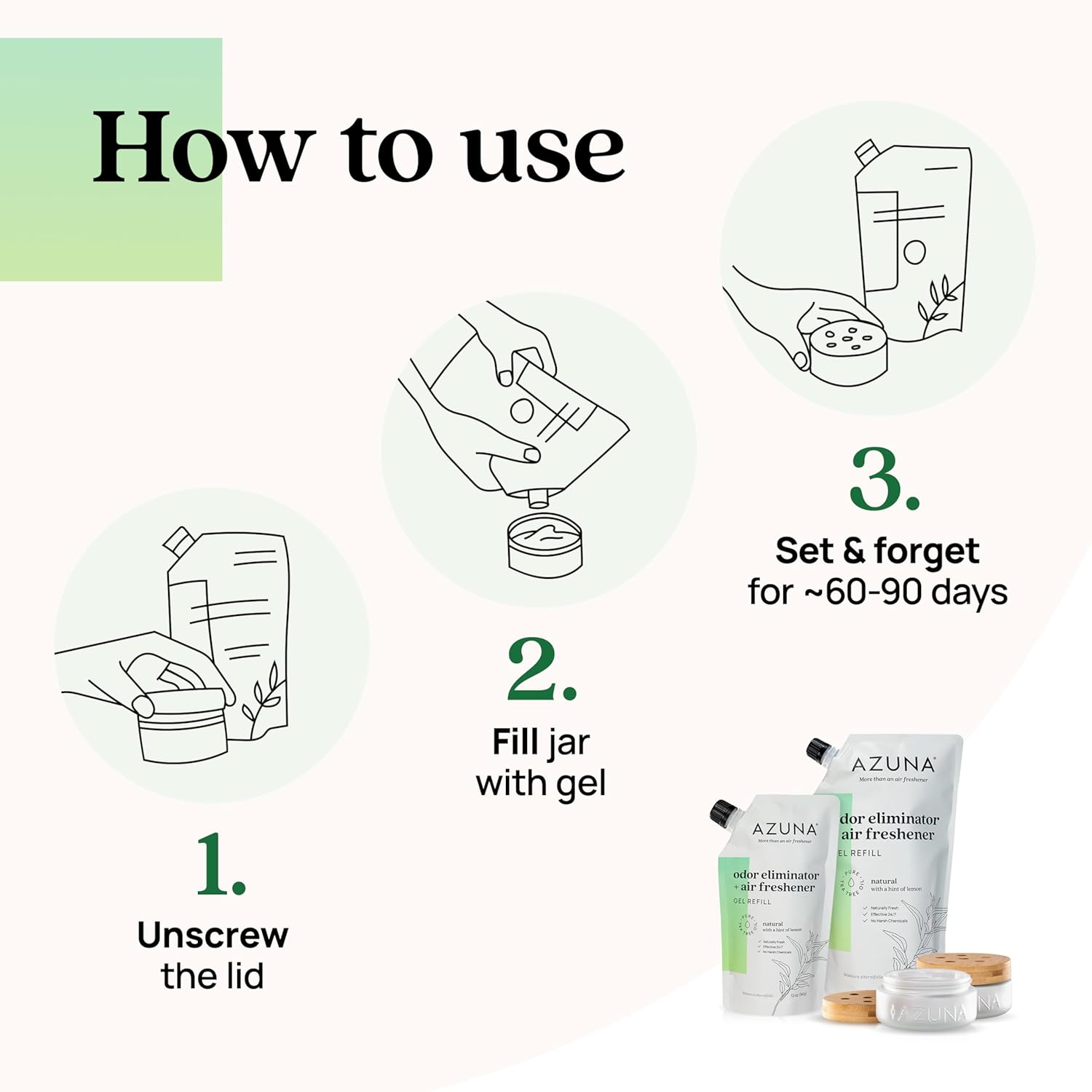 - Long-Lasting Room Freshener for Home: Enjoy continuous freshness for up to 60-90 days with Azuna's long lasting formula keeping your space smelling clean without the need for constant replacements. Just refill the jar with fresh gel when needed for a sustainable, reusable odor absorber solution. Ideal solution for those seeking room fresheners for home long lasting, delivering a natural and continuous freshness that keeps odors away.