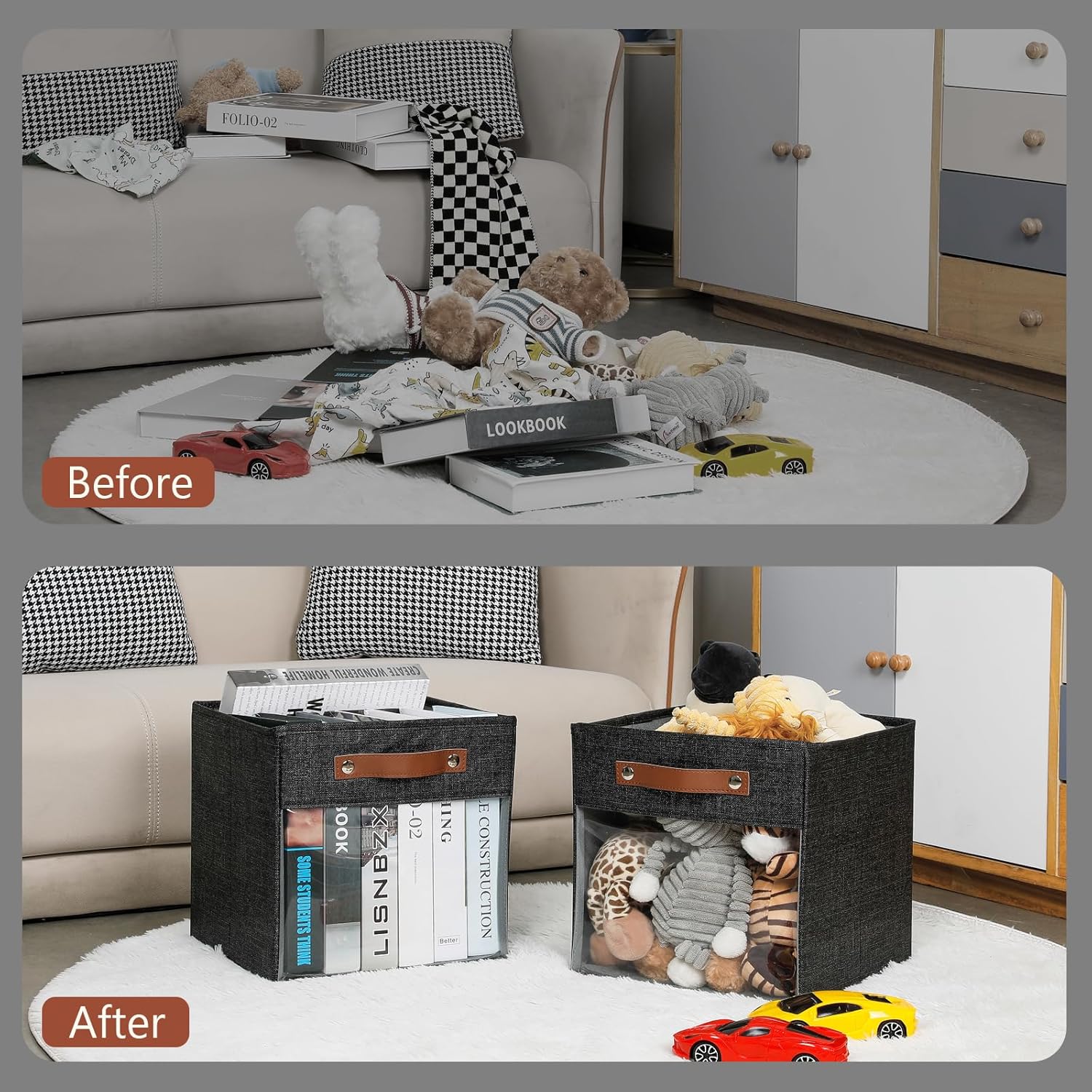 - 【FOLDABLE AND GOOD STORAGE】These decorative bins for cube organizer are foldable and easy to operate, just pull up the bottom plate to fold. When not in use, canvas storage bins for cube organizer is easy to fold flat, convenient storage occupies less space. At the same time, reduces the effort spent on storage.