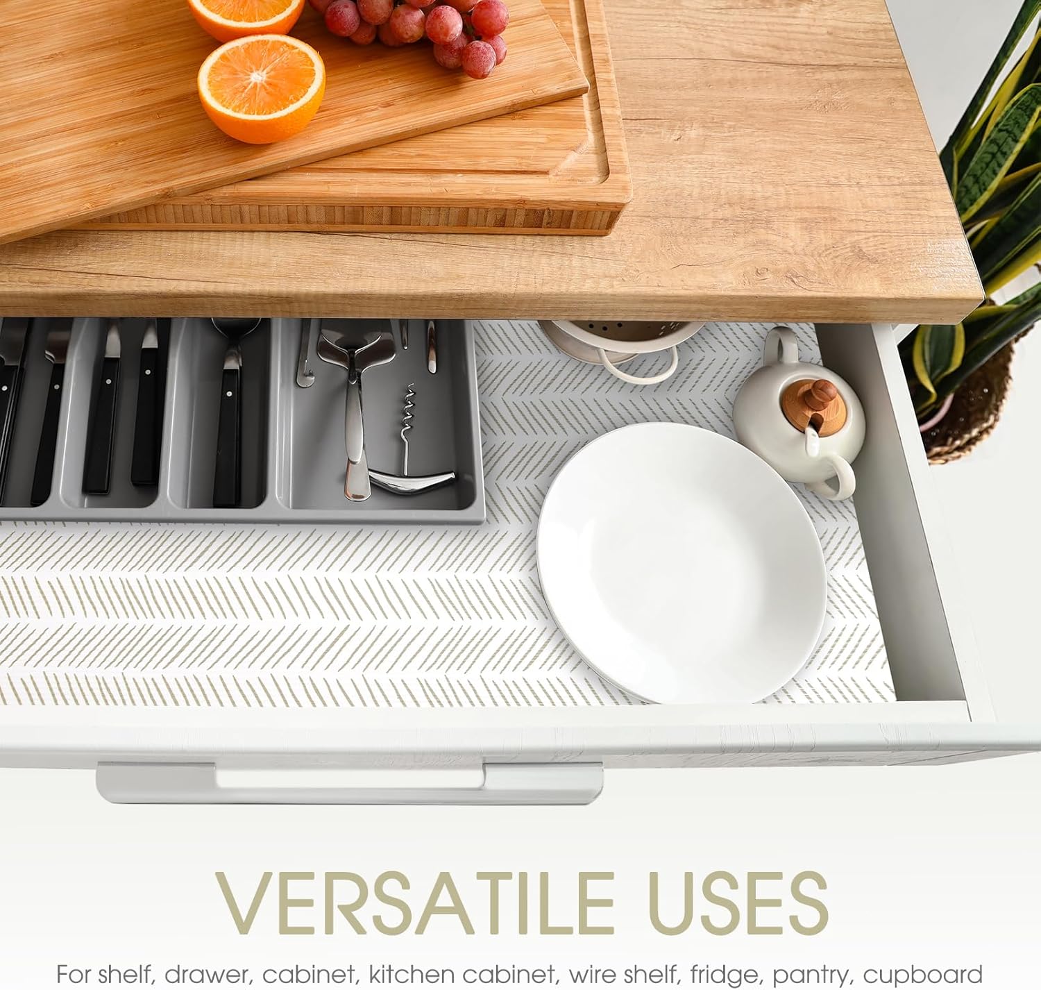 - Premium Cabinet Liner Made of Food-Grade EVA Material: This kitchen, drawer, cabinet, shelf, fridge and general storage shelf liner is made of BPA-free, odor-free, EVA material for your safety. The non-slip design sticker on the bottom of this drawer liners for kitchen allows your kitchen supplies to stay organized, in place and on the shelves, wire rack and pantry