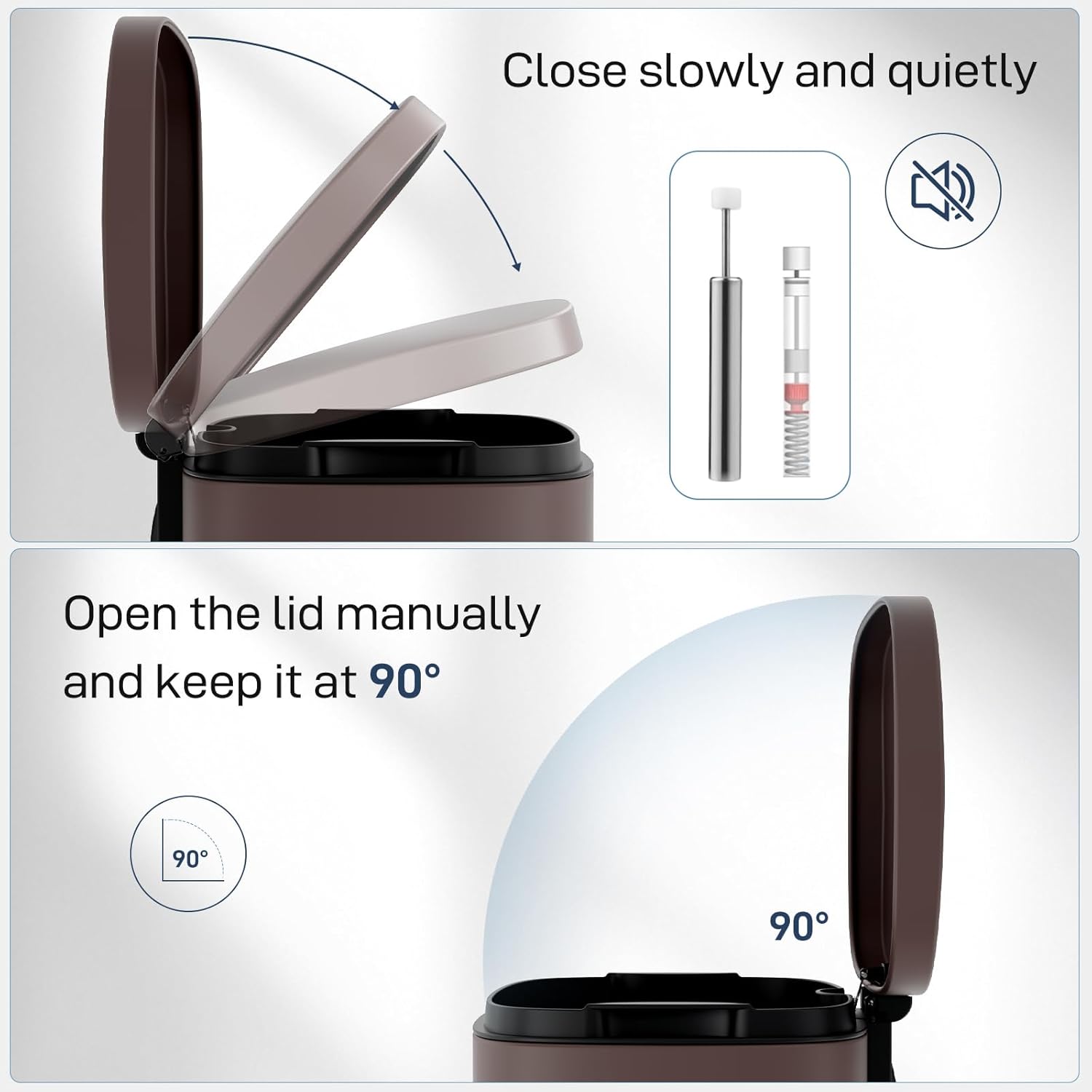 - 【WON'T DISTURB YOU】Using ABS hydraulic deceleration technology, the trash can lid can be slowly and gently closed when the pedal is released, without making a lot of noise, and it will not disturb your family when disposing of garbage.