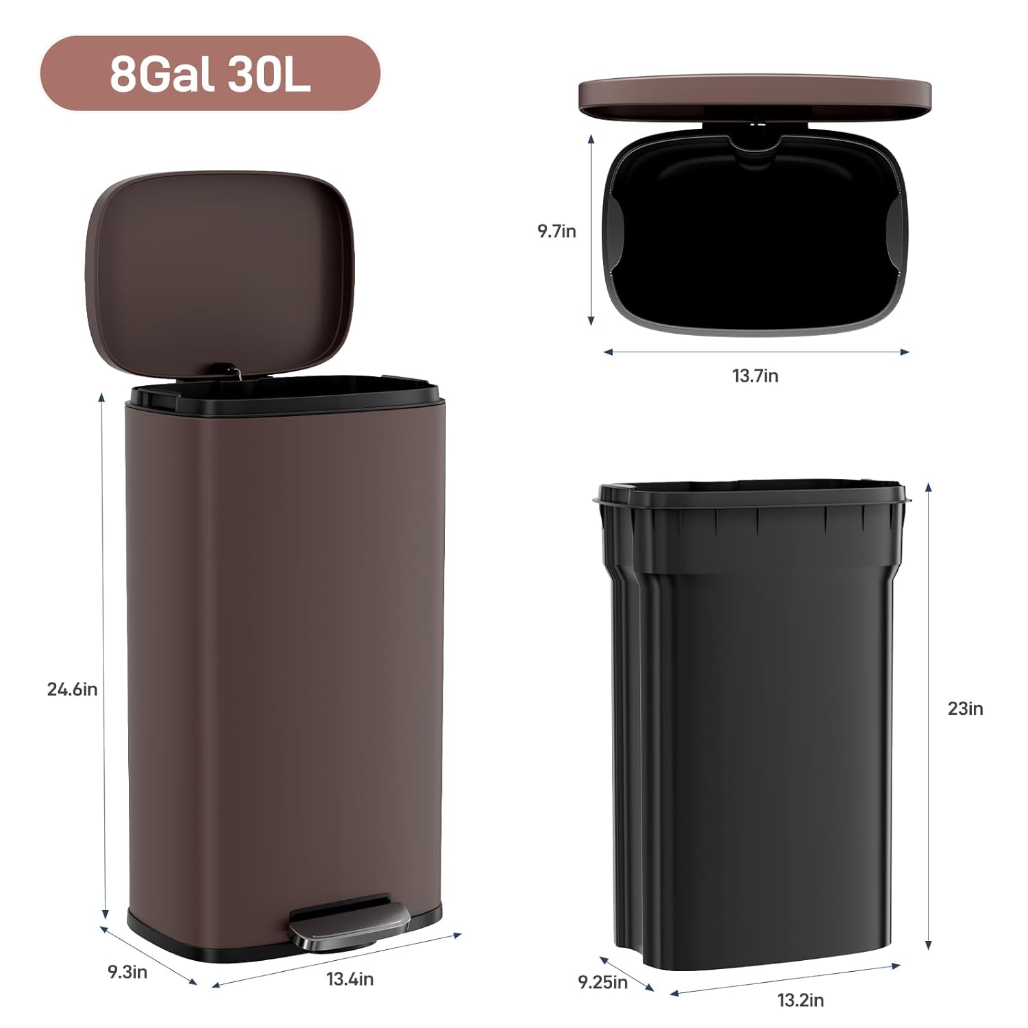 - 【30L/50L LARGE CAPACITY】Size is 13.4*9.3*24.6(L*W*H) /16.8*12.3*25.5(L*W*H)inches, and the large capacity of 30/50 Liter provides you with enough garbage storage space, saving you the time of frequent garbage disposal. Suitable for large families and offices, it provides more convenient services for your life.