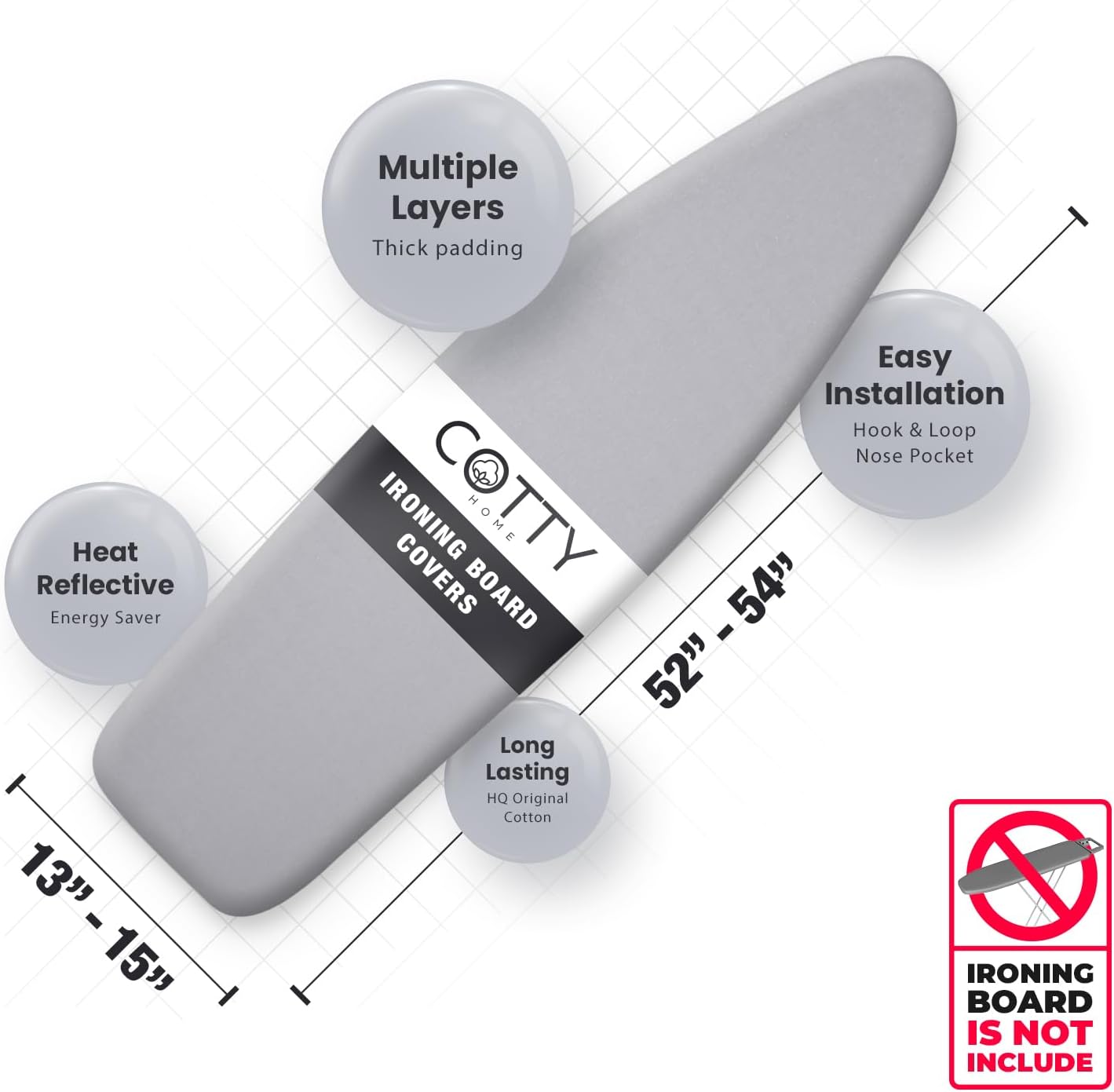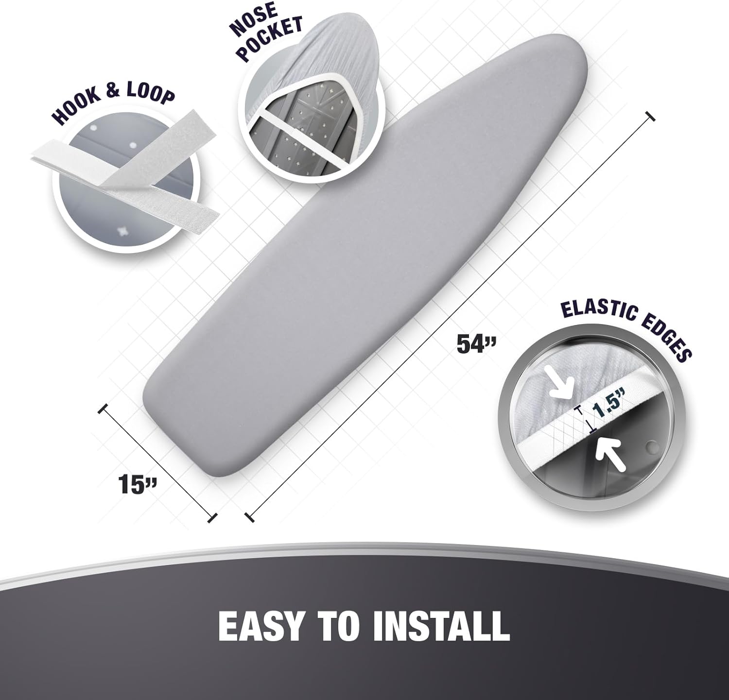 Extra Thick Ironing Board Covers with Pad Standard Size 15x54, Heat Reflective Full Scorch Resistant Padding, Snug Fit Non-Slip Nose Pocket Fastener Straps Elastic Edges, Gray