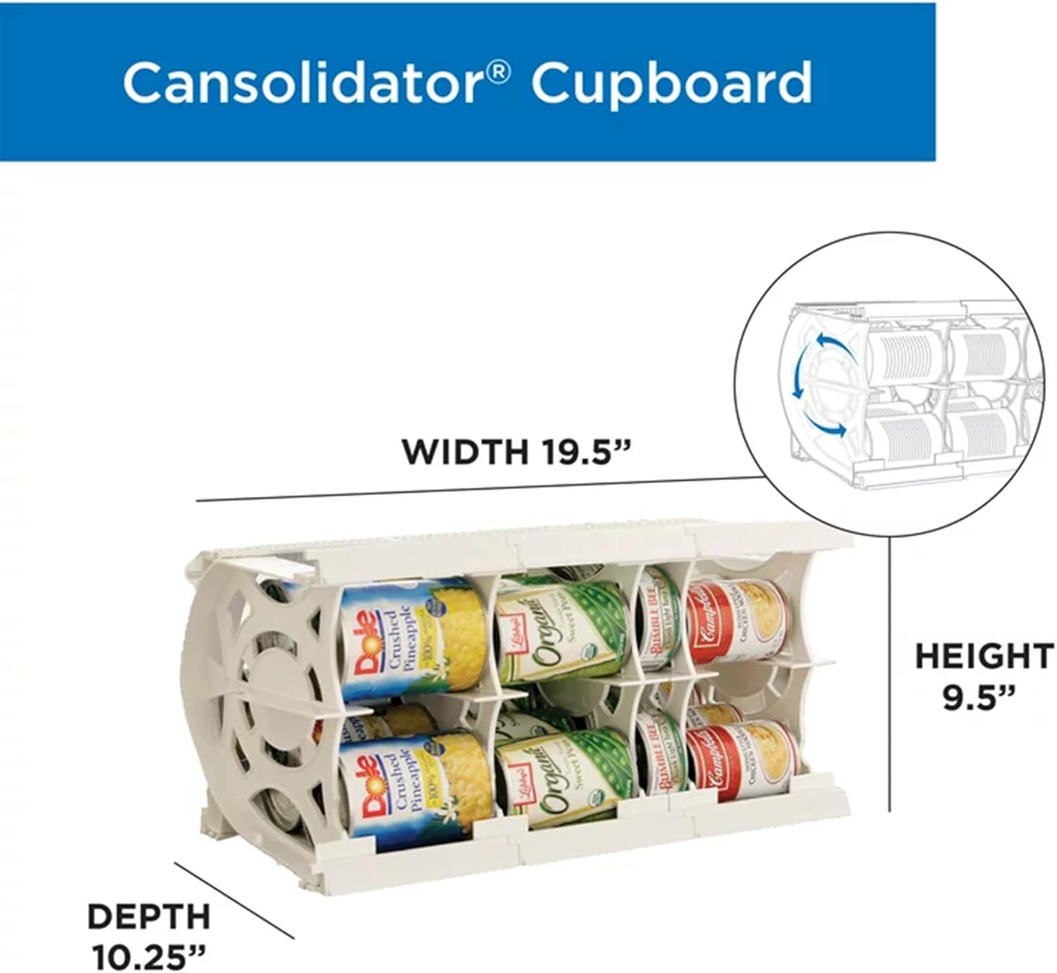 - MAXIMIZE SPACE, MINIMIZE MESS - The Cansolidator Cupboard is a rotating can organizer that holds up to 20 cans, keeping your pantry, cupboards, or fridge neat and clutter-free.