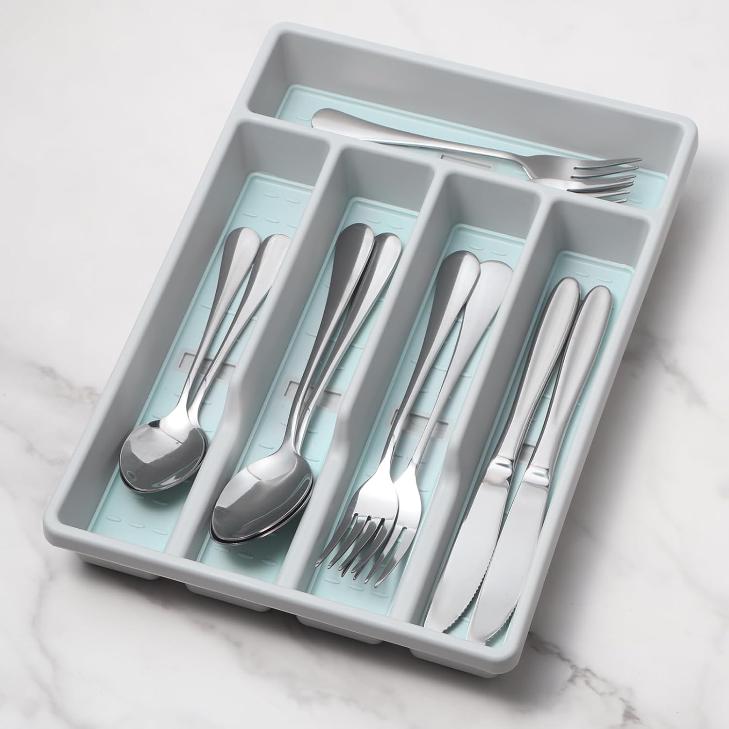 - FITS WELL IN MOST KITCHEN DRAWERS:This 5-compartment silverware tray measures 12.6"L x 8.9"W x 1.8"H,ideal for use with drawers that are not very large,the compact design won't take up too much drawer space, and it will be a pleasure to open the drawer and see your cutlery organized in the tray.