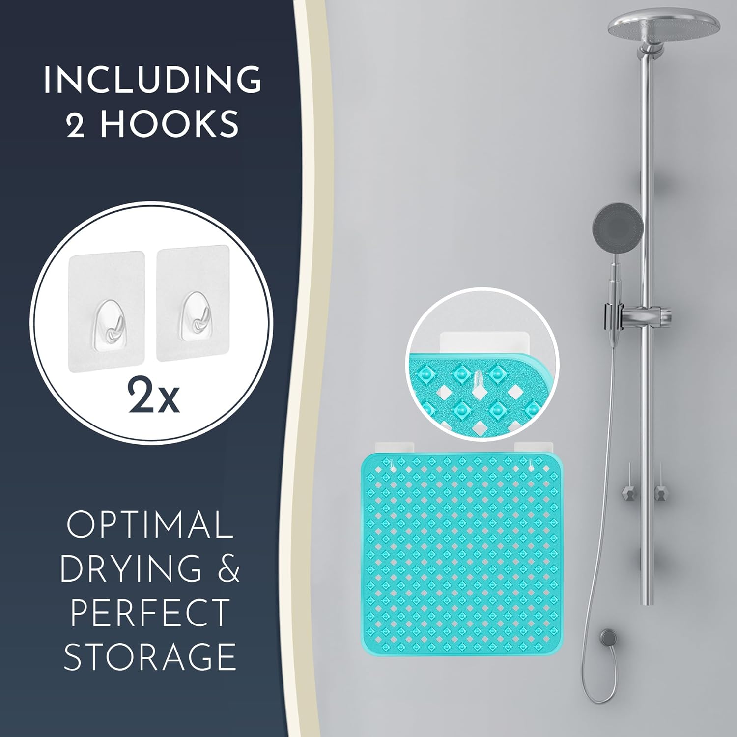 - Easy to Dry - Includes Hooks - No more wet rubber bath mat on the edge of the bathtub! Thanks to the 2 self-adhesive hooks that can be removed without leaving any residue, the shower anti slip mat can be dried perfectly invisible!