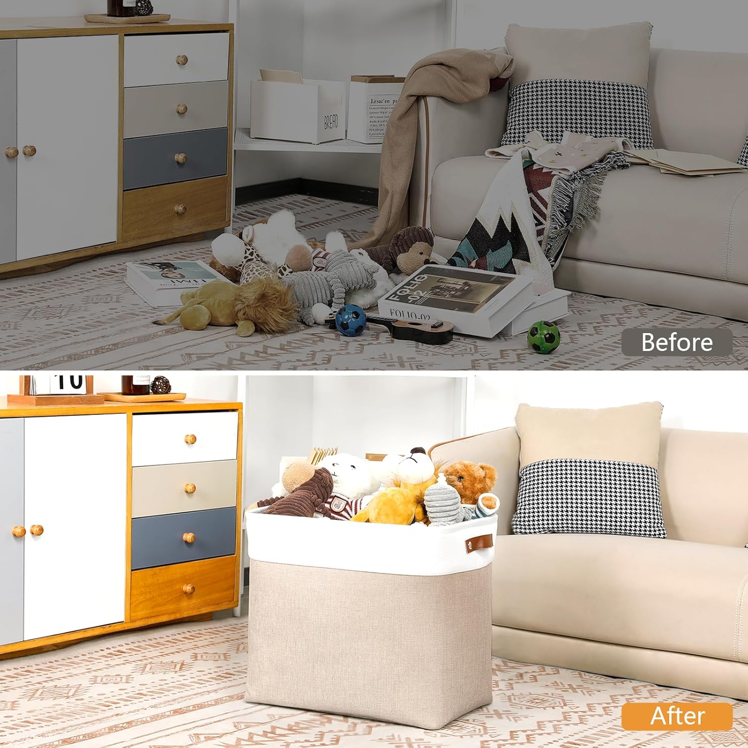 - 【Care】The fabric basket set comes with compression packing which may result in wrinkled and crumpled in long-distance transit. It can be smoothed out by steam iron.