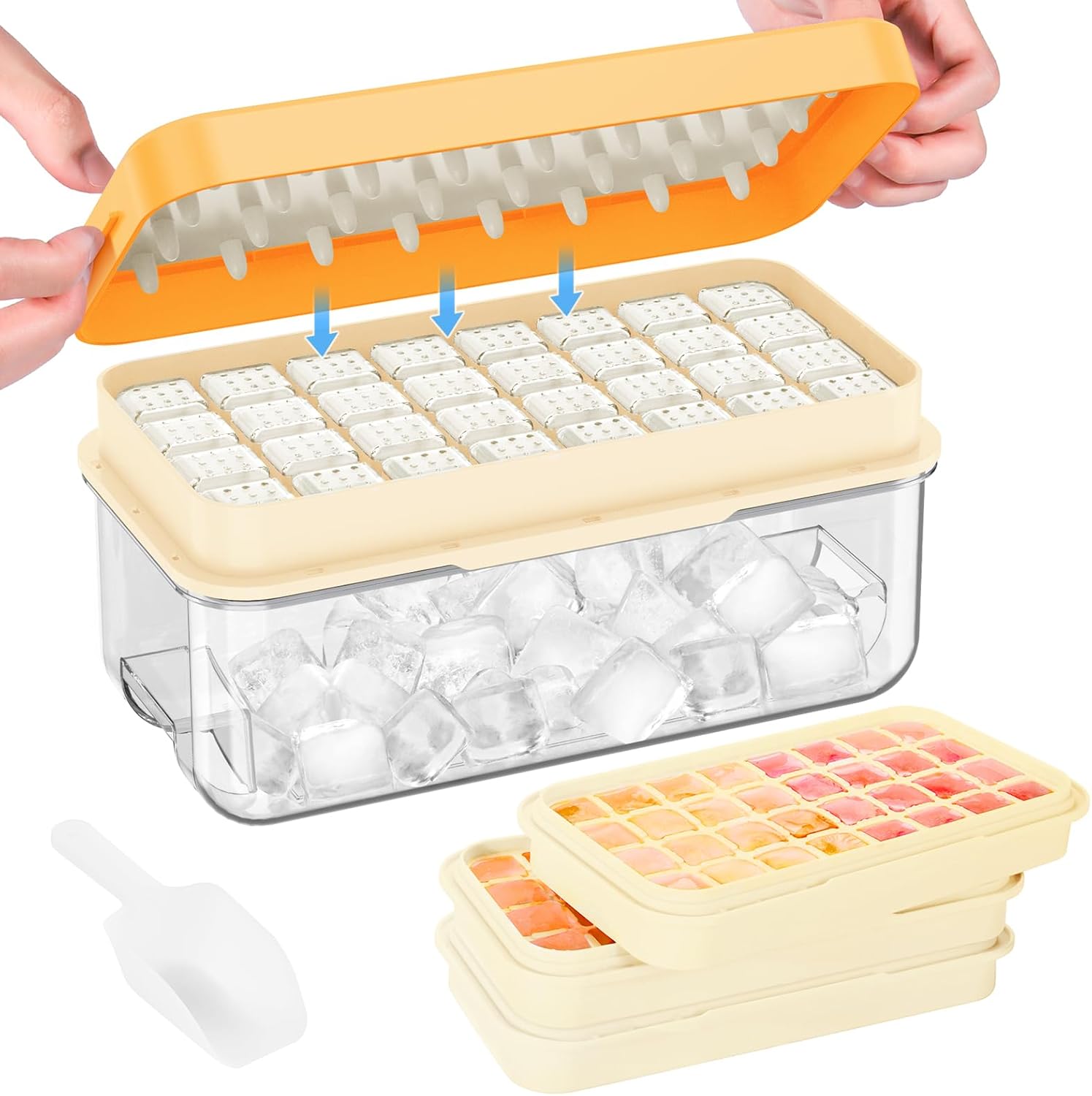 - Newly upgraded press-type ice cube trays, Releases all ice cubes in one second: This ice cube Molds is made of high quality food grade hard plastic and is BPA free. After placing one ice tray upside down on the ice storage bin, close the lid and press the middle of the lid with both hands, all ice cubes can be easily released in one second