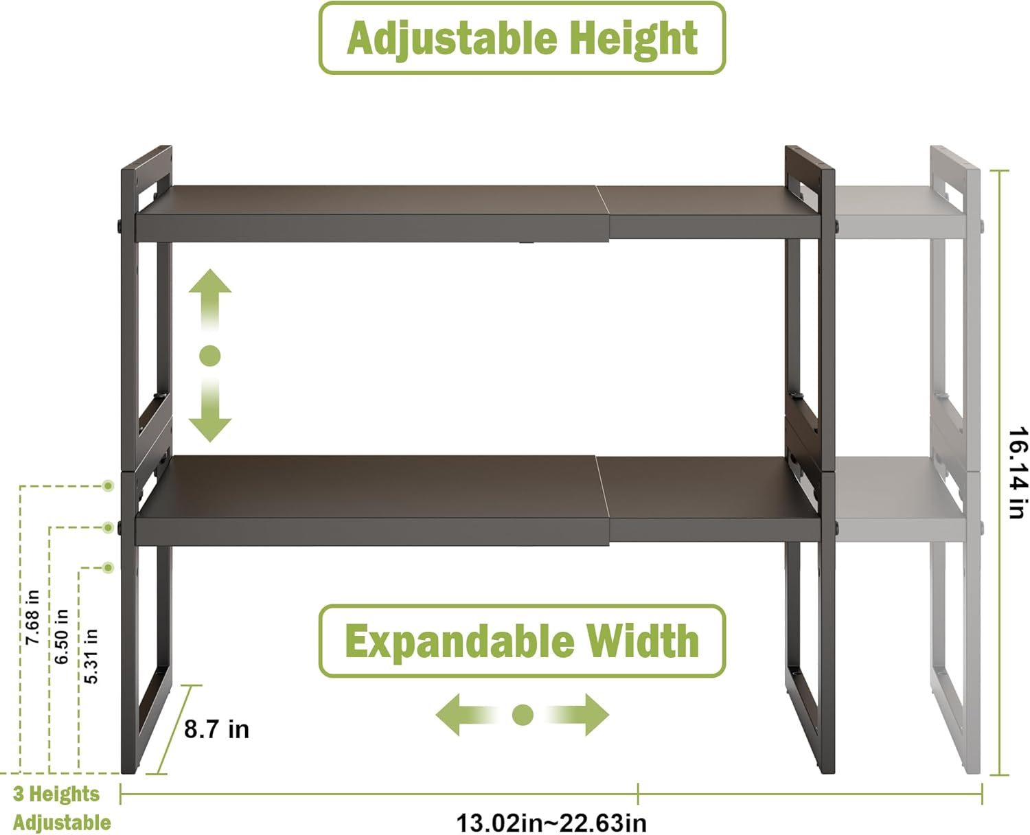 - 【Expandable & Stackable Cabinet Organizer】The length and height of this shelf can be adjusted, The length of expandable shelf can be adjusted from 13 to 23 Inches according to the different space; The Height can be adjusted from 5.1 inches to 7.5 Inches depending on how you want to arrange your space.