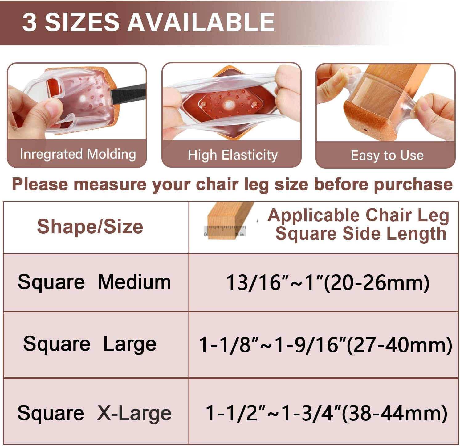 - [Applicable size range]- Our chair leg protectors are made of stretchable silicone, with a narrow top and wider bottom to adapt to different chair legs. Square Medium fits chair legs with a side length of 13/16" to 1" (20β26mm).Please measure your chair leg size before purchasing.