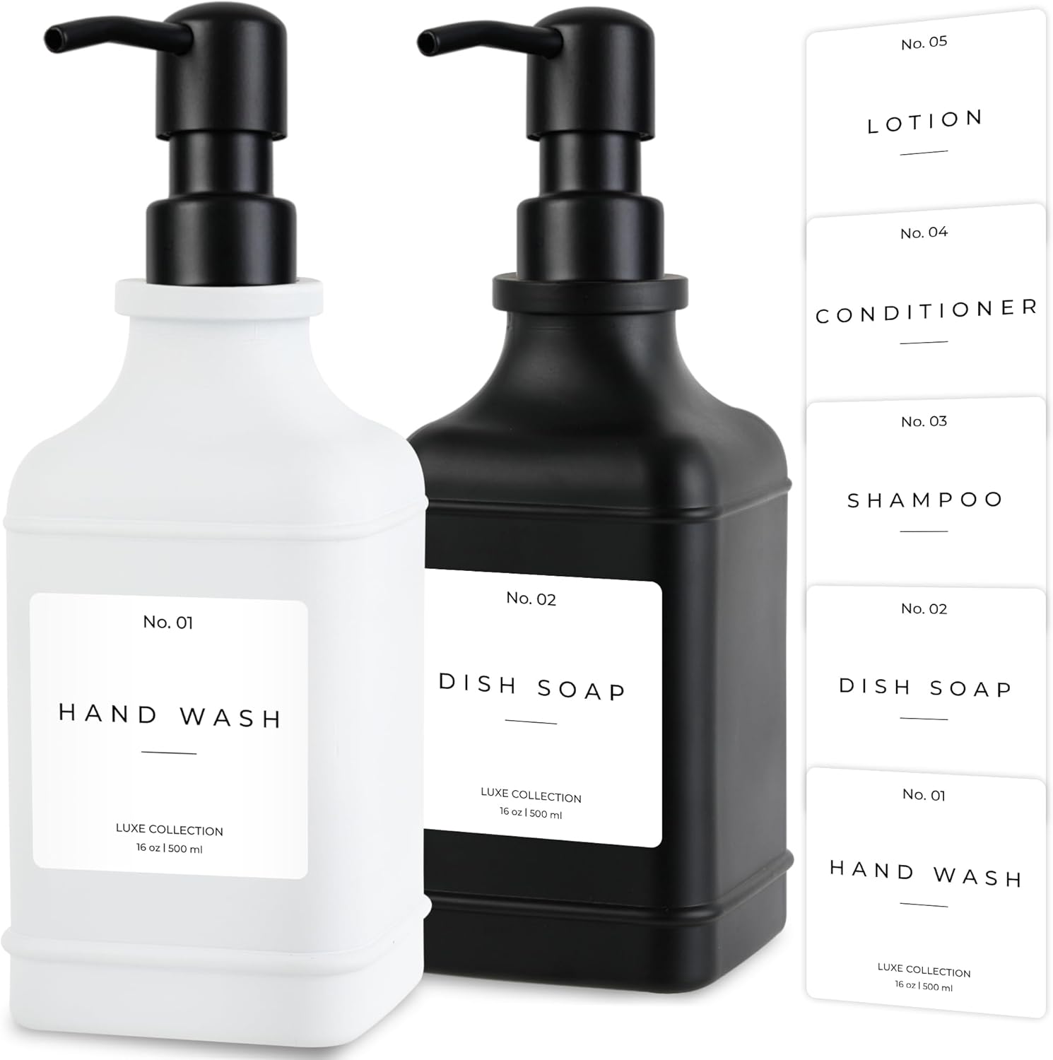 - ✅ 5 WATERPROOF LABELS: Now with 5 stickers, it's your choice to use the Kitchen Soap Dispenser Set with Dish Soap for hand soap, dish wash, lotion, conditioner, or shampoo. To clean the lotion dispenser set for the bathroom and kitchen sink soap dispenser set, just run the bottle under water and watch any residue simply wash off. With our exclusive no-leak pump, the bottle enables you to put out a good amount of soap with a single pump.