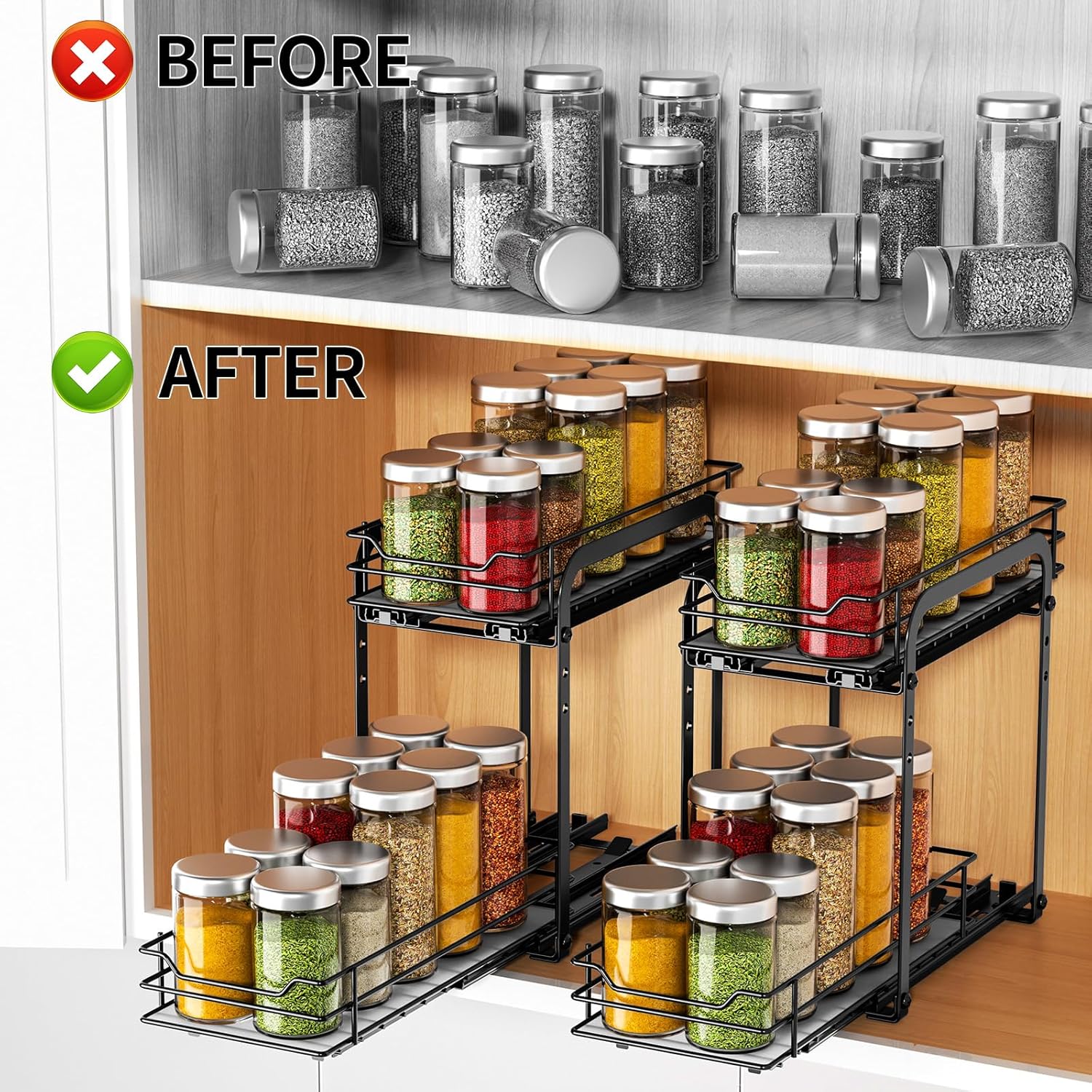 - SMOOTH SLIDING & ELEVATED GUARFRAIL- The rails are designed with a ball bearings system to ensure smooth slide, so you can slide the rack with a full load of spice jars effortlessly. Full extension glides offer you easy complete access to all spices inside the kitchen upper cabinets. The spice rack has guardrails, preventing the spice jars from tipping over or drop out of the basket when you pull out the spice rack.
