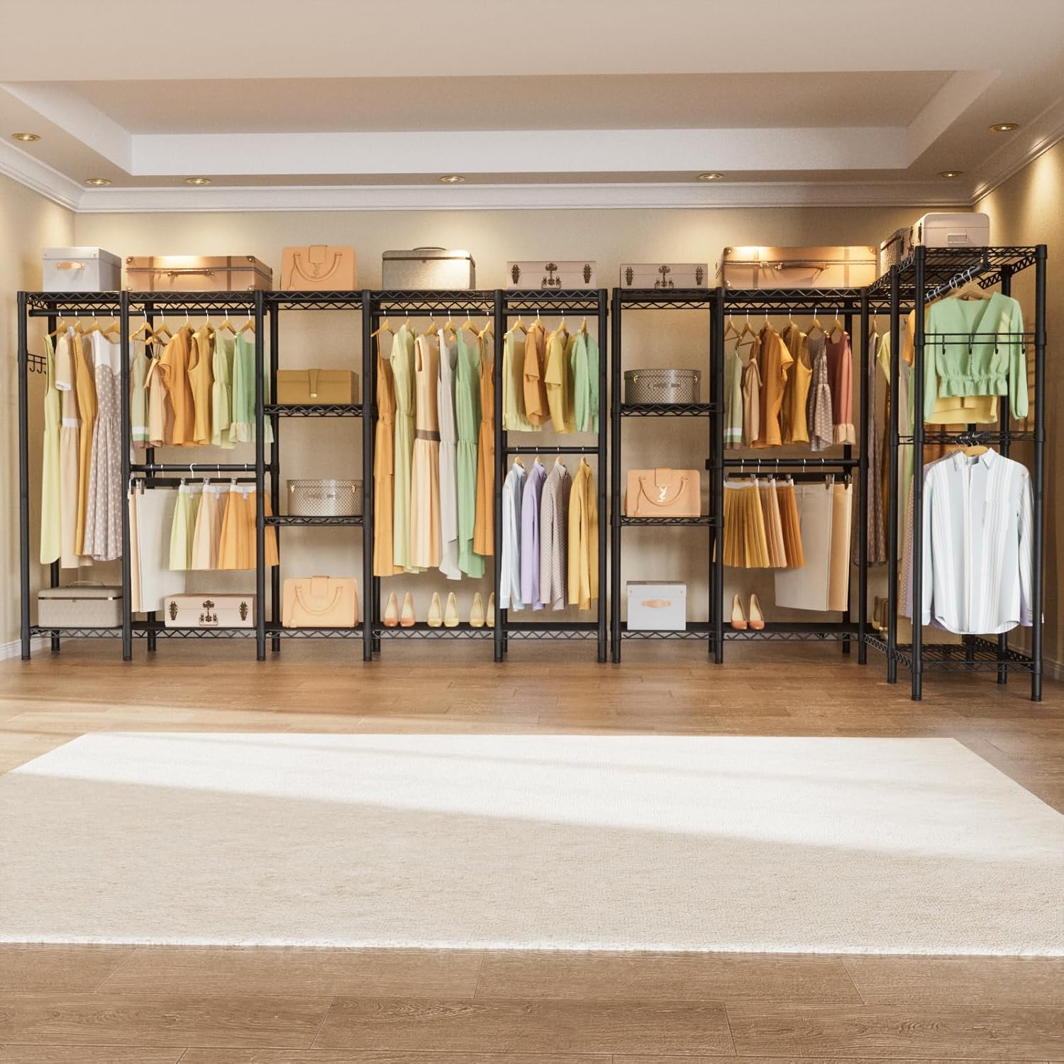 - Versatile Storage Solution: Elevate your organization game with Golpart's 5 Tiers Extra Large Garment Rack. Featuring 8 height-adjustable shelves and 4 detachable hanging bars, this multifunctional closet rack offers a variety of storage options for clothes, accessories, and shoes. Customize your space effortlessly to accommodate garments of different lengths and sizes